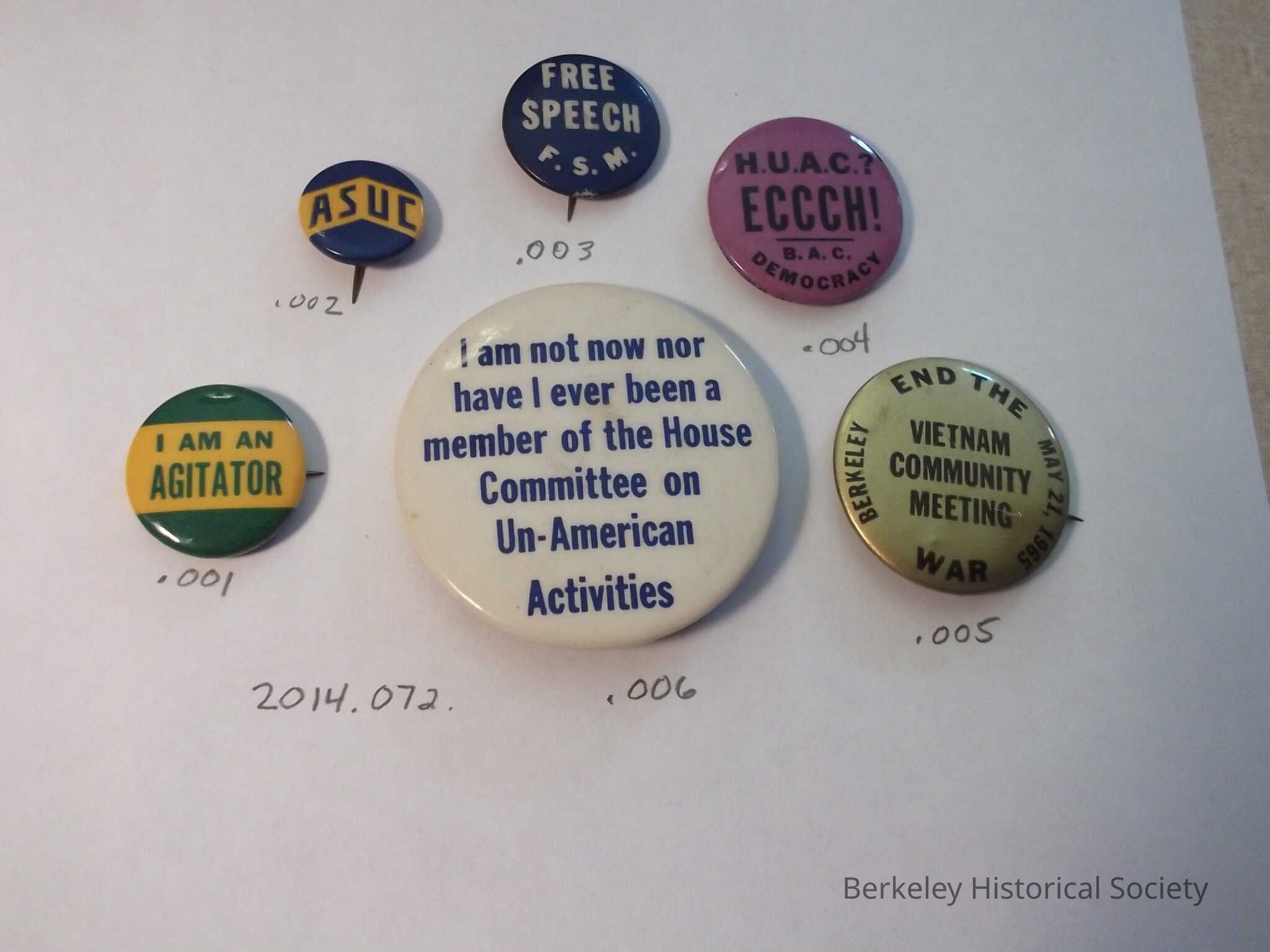 Round metal and paper political button in white and blue "I am not now nor have I ever been a member of the House Committee on Un-American Activities".