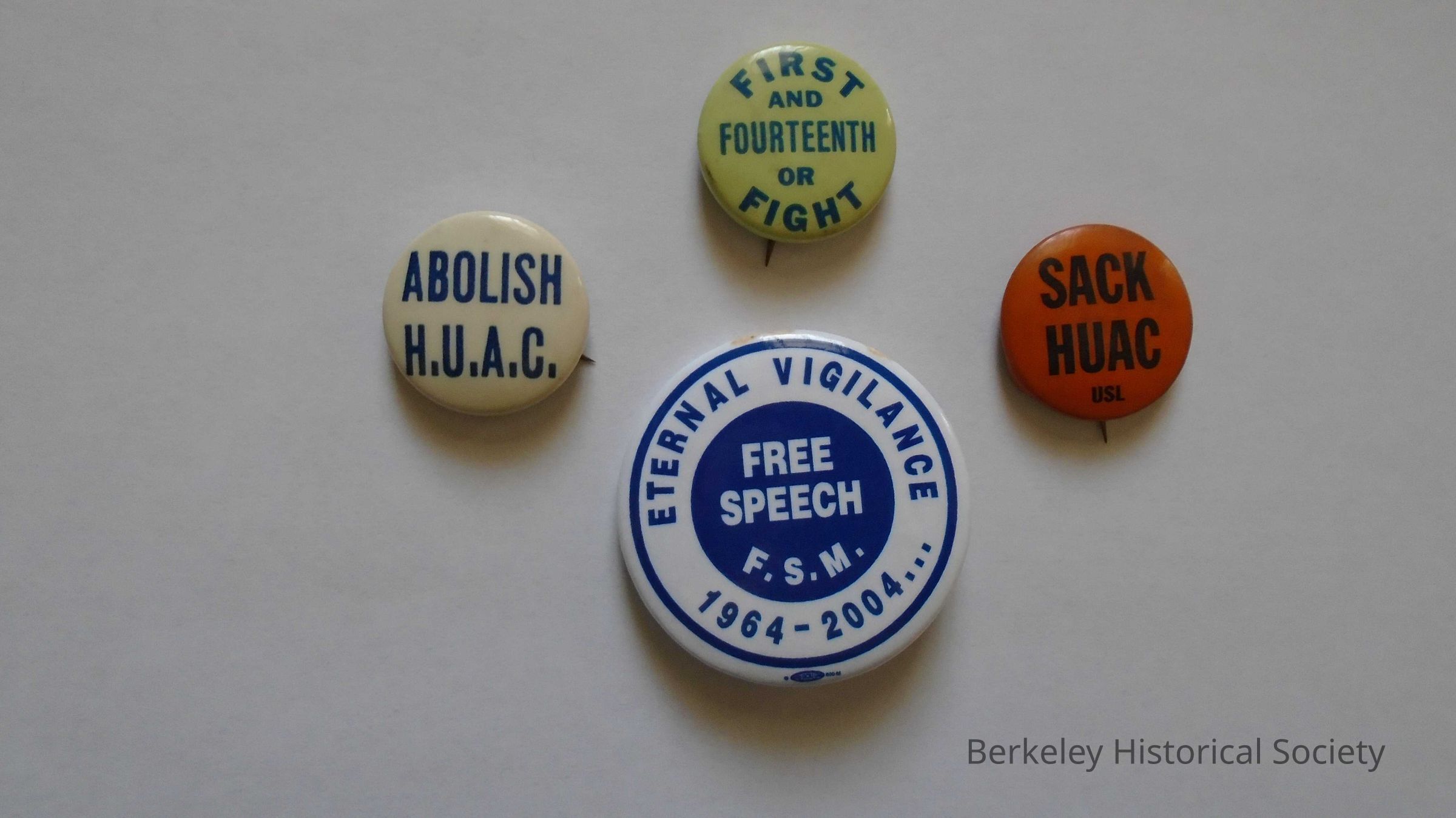 Round paper and metal political button "SACK HUAC usl" in orange and black.