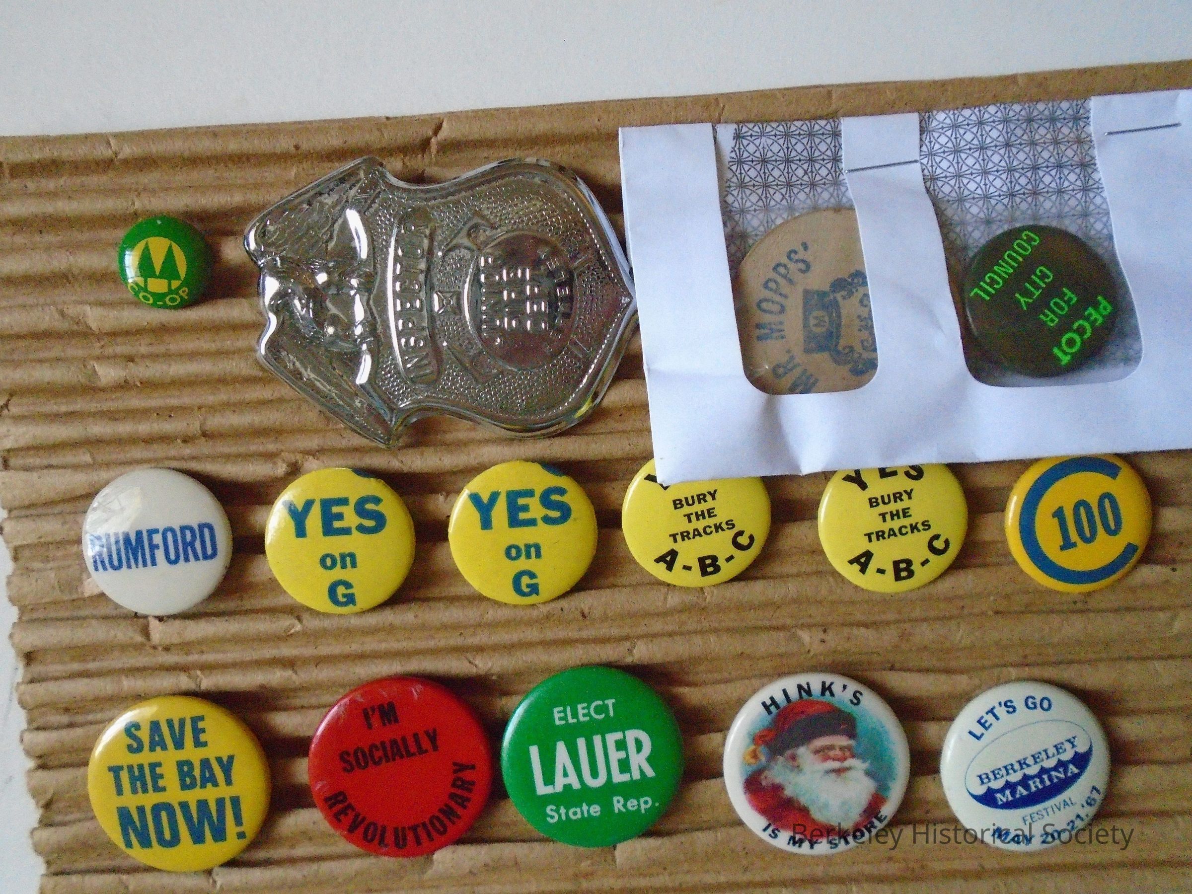 Corrugated cardboard square with 13 buttons, 1 badge and 1 wooden coin attached, associated with Berkeley in the 60s. Metal badge is for Jr. Fire Dept Berkeley, wooden coin is for Mr. Mopps', metal buttons for Hink's, Co-op, Marina, Save the Bay, I'm socially revolutionary, Rumford, Lauer and other election issues.Made/Created