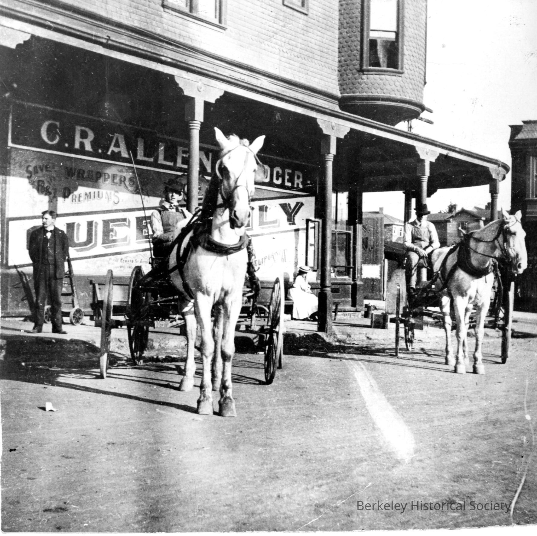 Allen on sidewalk; two men on horses in front of building, Fred Humphries and Charlie Peterson. Store at Shattuck Avenue and Vine Street.Other Names and Numbers