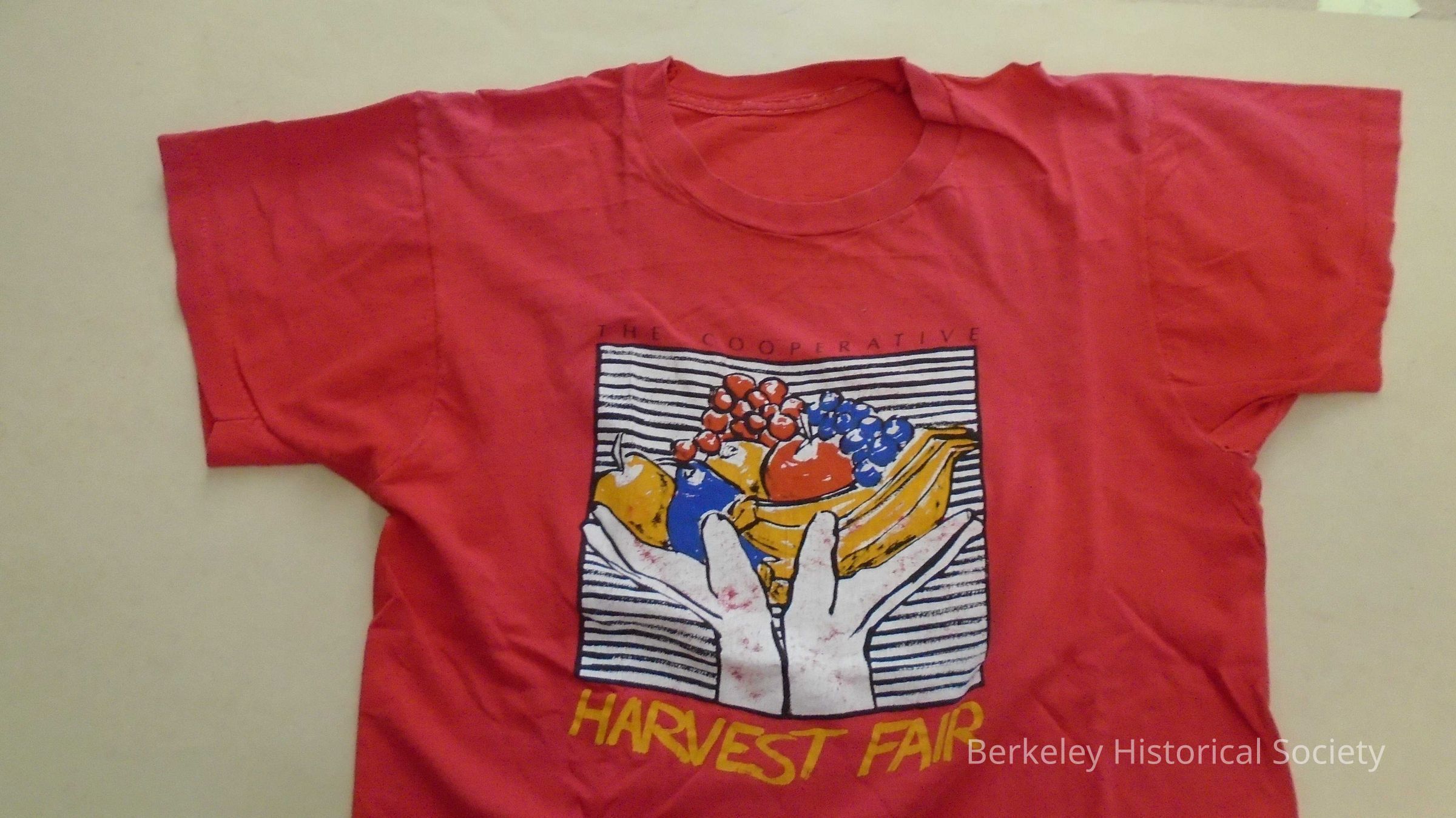 Cotton red short sleeve T-shirt with picture of hands holding fruit and text: The Cooperative Harvest Fair. Label missing. Probably size M. Neck torn and several holes front and back.