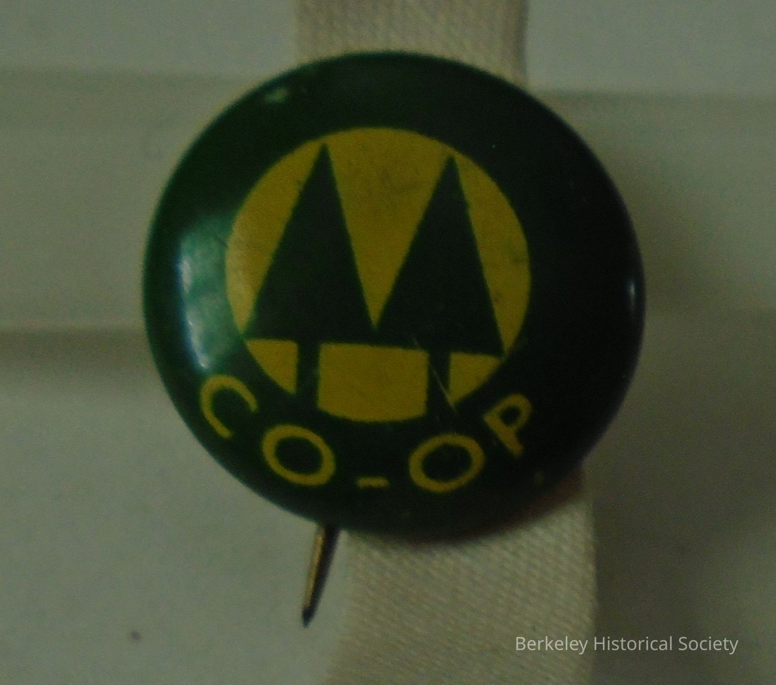 Round, green and yellow, metal button with Co-op logo of twin pines in a circle and "CO-OP" under it.