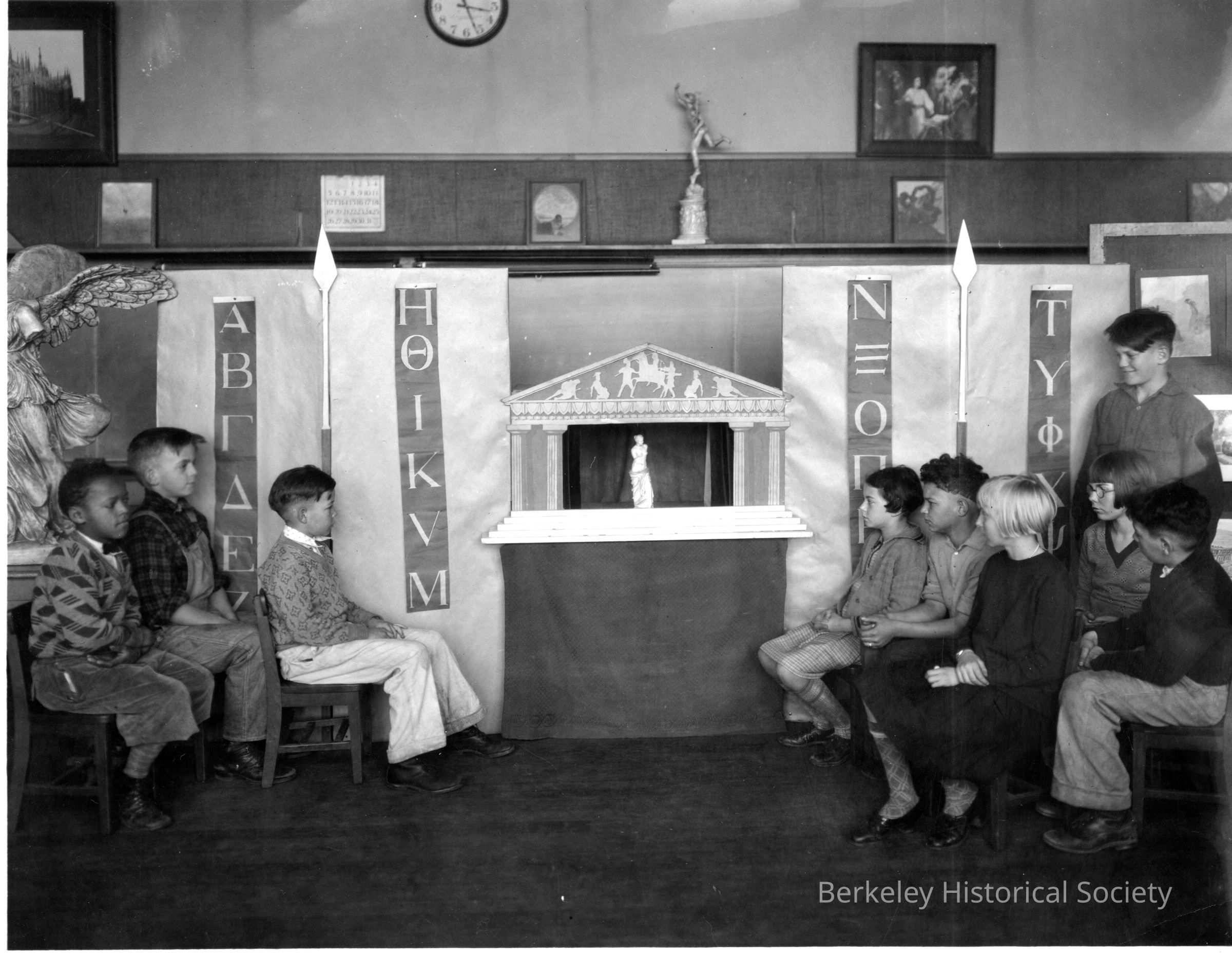 Students seated on both sides of display with Greek statue; panels with Greek letters hanging on sides. Miss Burrough's room.Other Names and Numbers