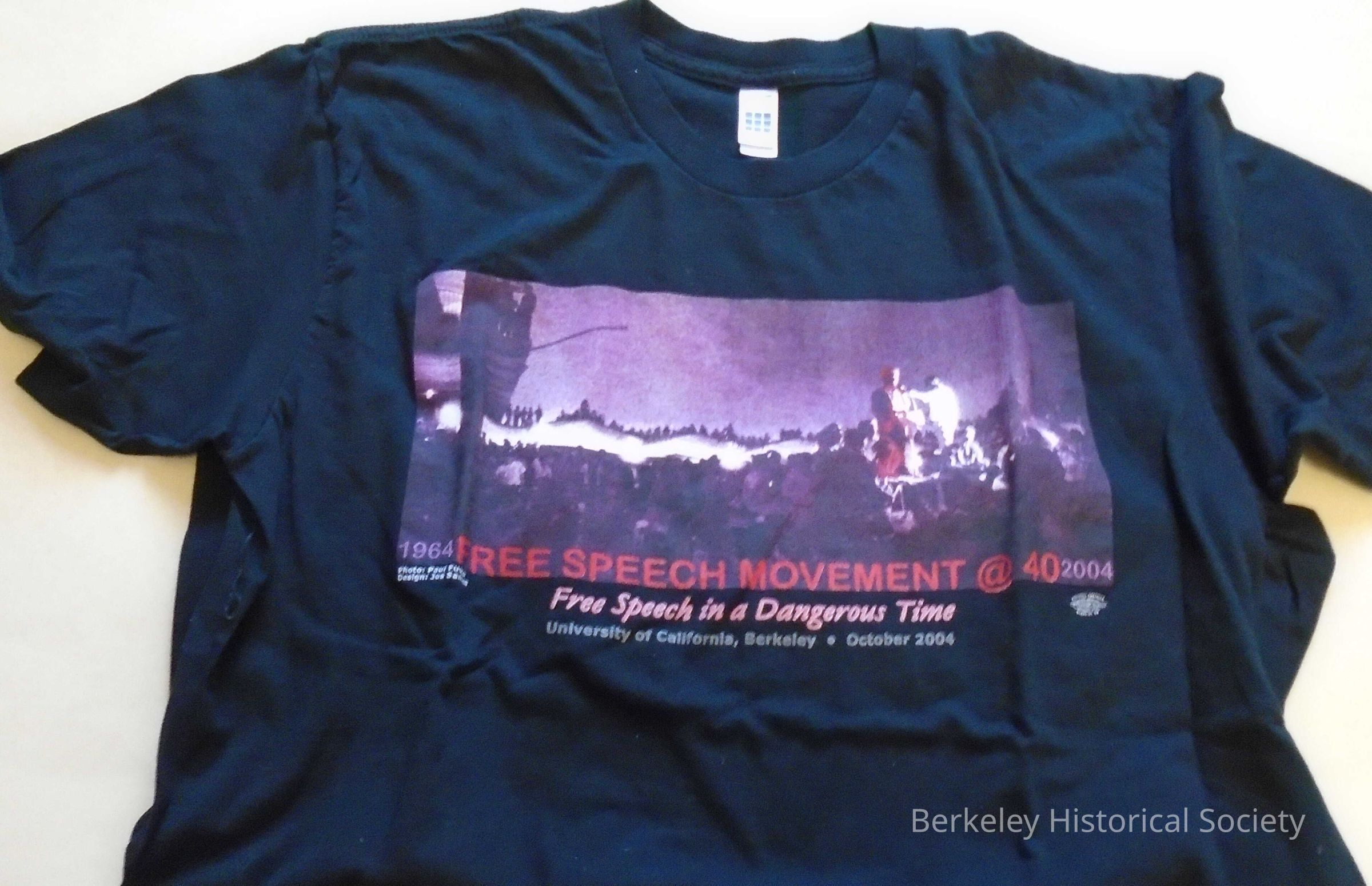 Black cotton short sleeve T-shirt (tee shirt). Issued in celebration of the 40th anniversary of the free speech movement. Front printed with "1964 -FREE SPEECH MOVEMENT @ 40 -2004