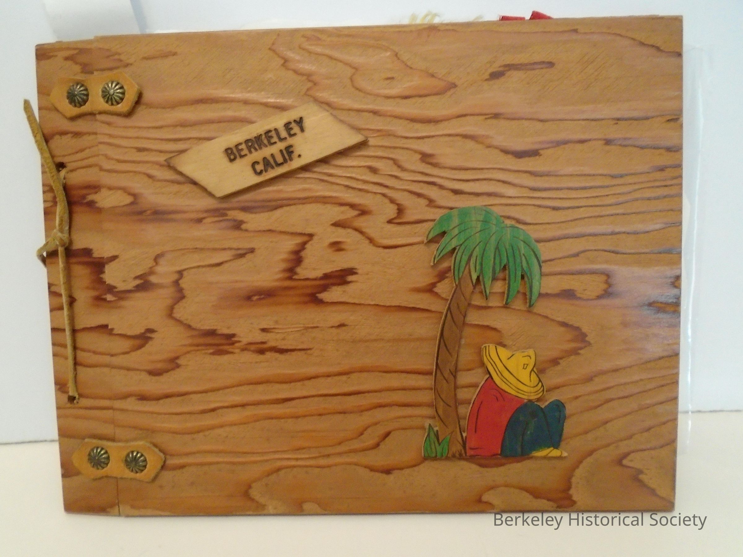 Scrapbook with wooden cover belonging to Jimmy (James) Wagner, 1557 Visalia Ave., Berkeley. Held together with leather and tacks. In relief on cover: slumbering man/sombrero and "Berkeley, Calif." Contains holiday cards and memoribilia relating to Garfield Junior High School and Berkeley High School, 1940-42 . Also Berkeley Junior Traffic Police certificate, Washington School, 1937-8.Lexicon