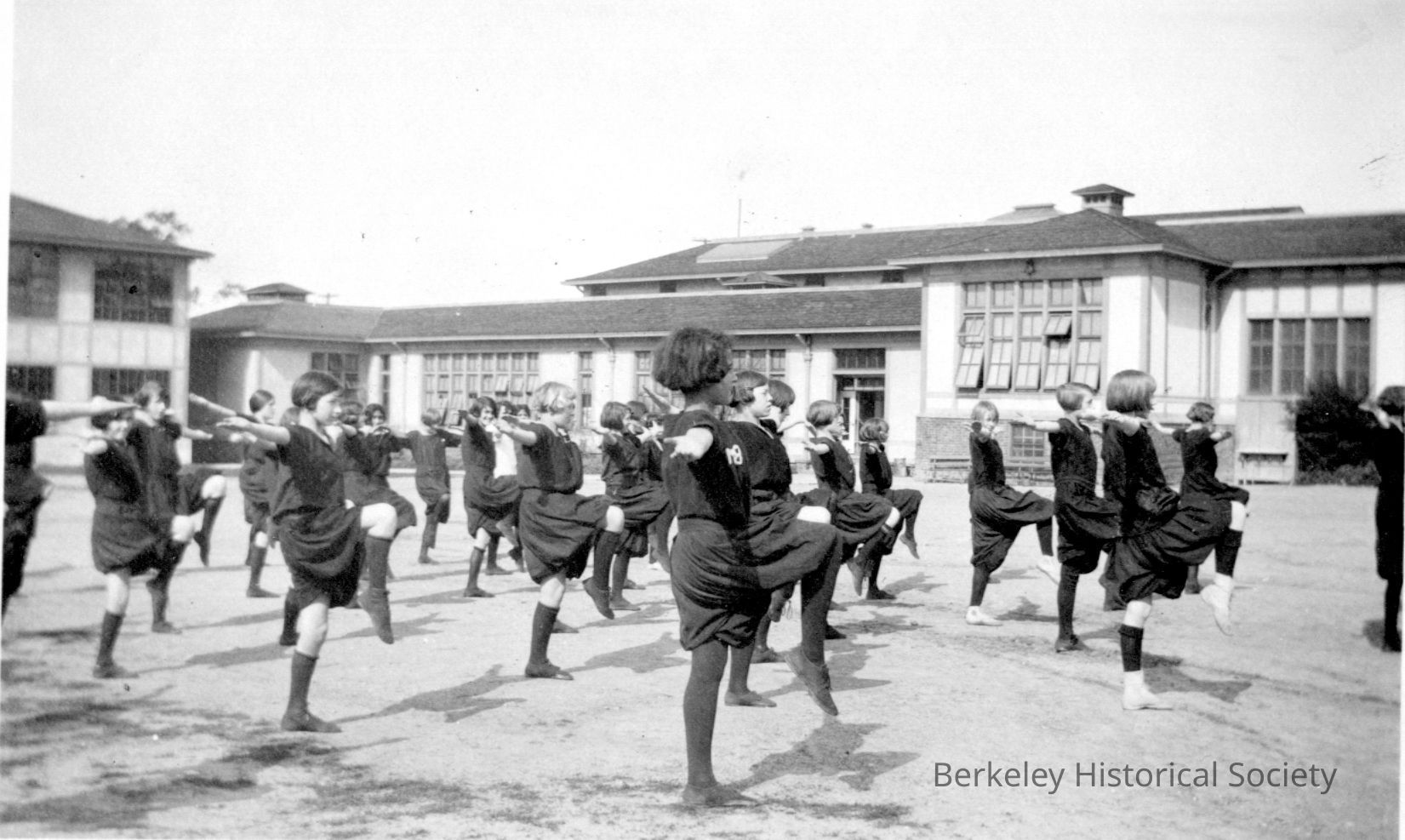 Girls with one knee raised and arms outstretched;; exercising in the school yard.