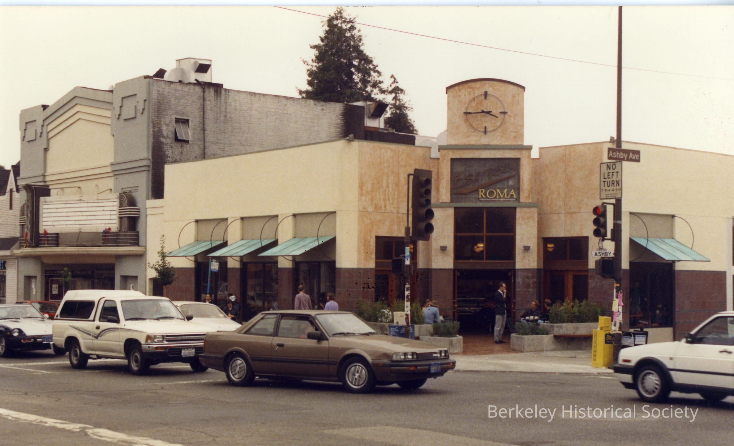 Cafe at corner of Ashby and College Avenues from across the intersection. Cafe closed by fire. Elmwood Theater to left, marquee is blank.