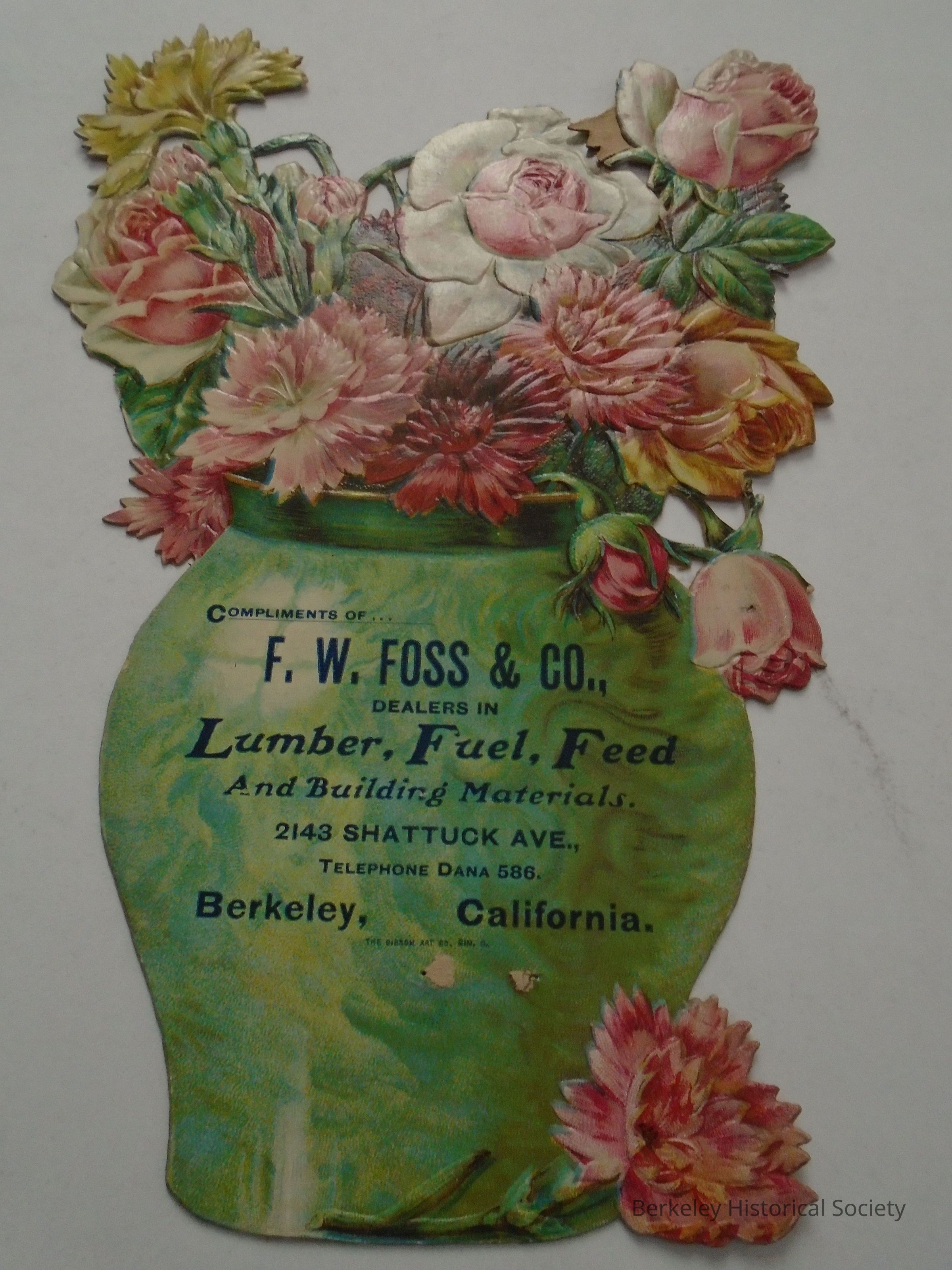 Cardboard calendar backboard cutout of a vase of flowers. Staple holes where a small calendar is missing. "Compliments of F.W. Foss & Co., dealers in Lumber, Fuel, Feed and Building Materials; 2143 Shattuck Ave., Berkeley, California, telephone Dana586".