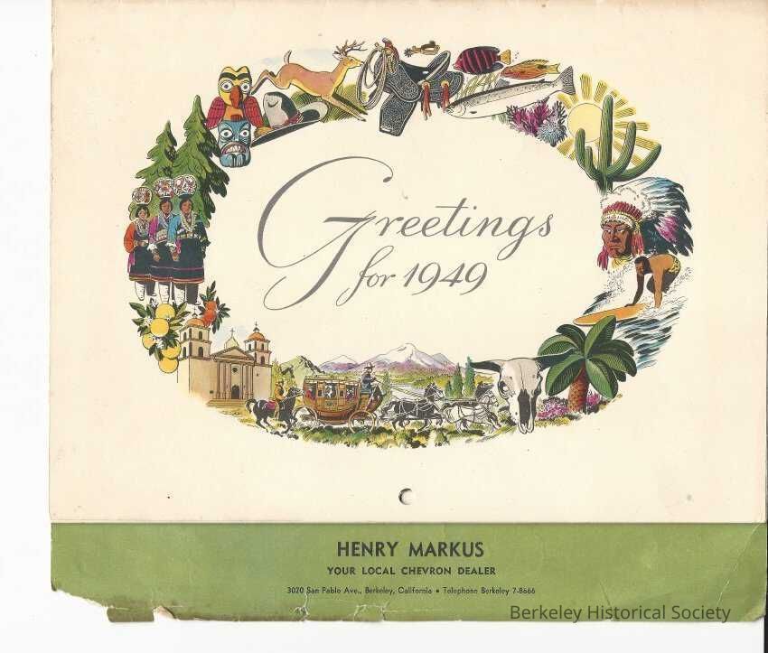 Paper hanging calendar with "Greetings for 1949" on the front in a circle of western type pictures (stage coach, totem, cactus). Henry Markus, your local Chevron dealer, 3020 San Pablo Ave., Berkeley, California Telephone Berkeley 7-8666. Pictures are outdoor scenes & parks.Lexicon
