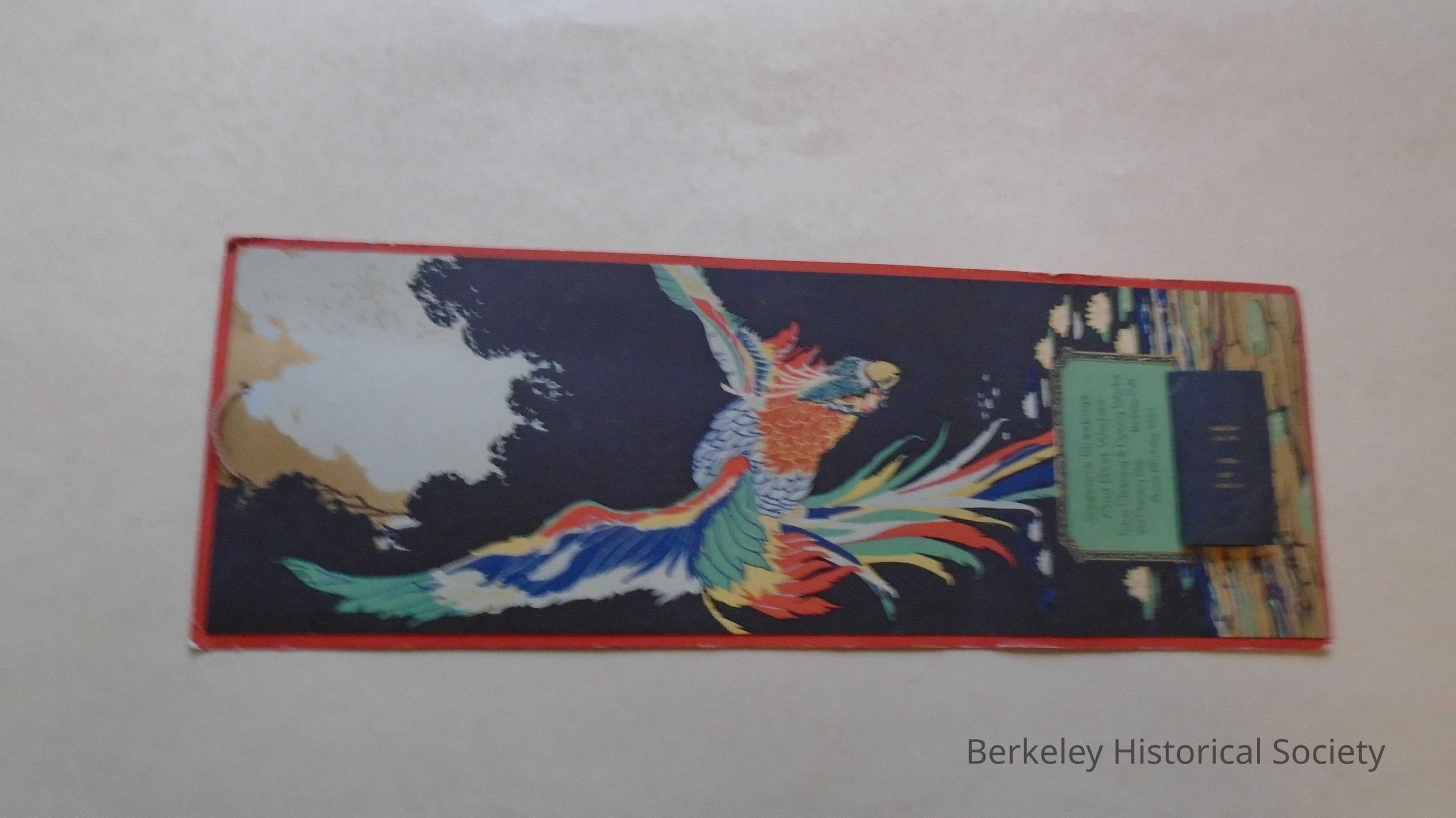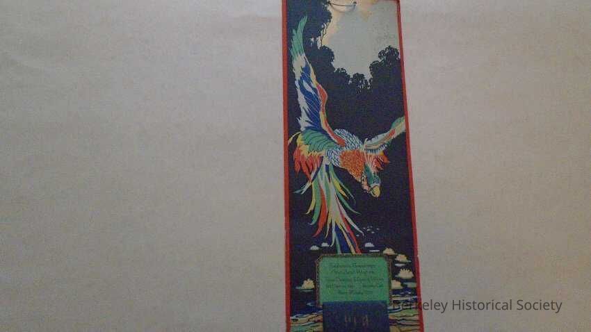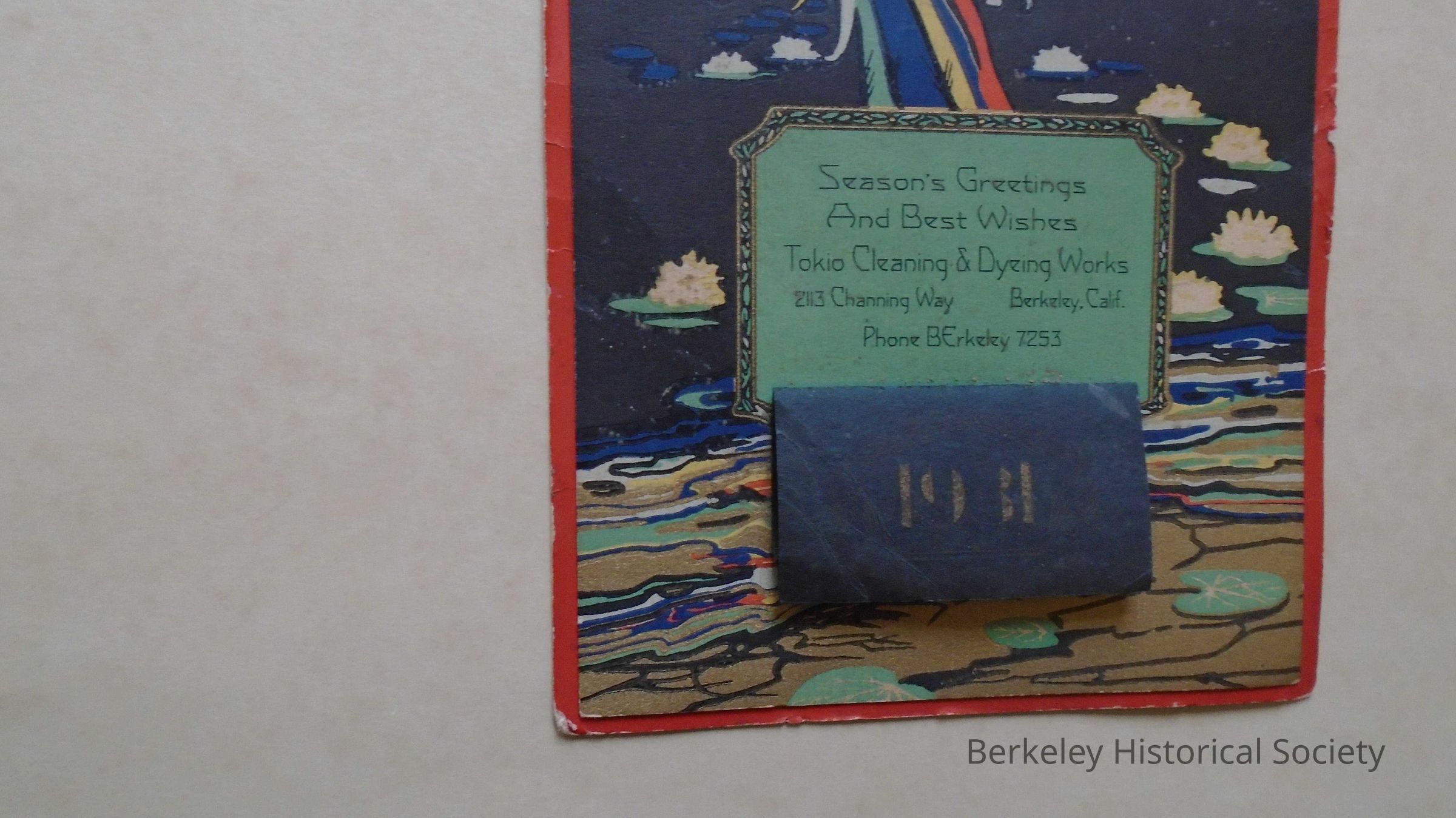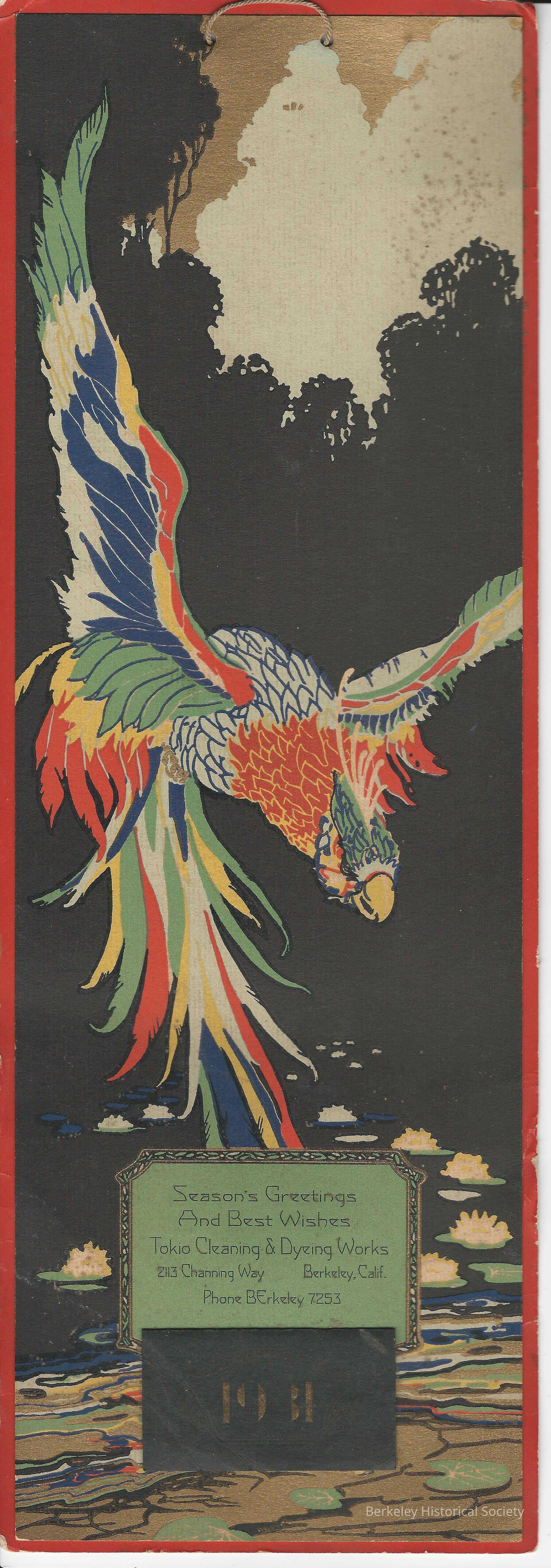 Cardboard and paper 1931 calendar for "Tokio Cleaning & Dyeing Works, 2113 Channing Way Berkeley, Calif. Phone BErkeley 7253." Colorful picture of bird flying over a lily pond (orange, green, gold, blue, black & white), "Season's Greetings and Best Wishes". Small flap at bottom with monthly calendar for December remaining.Lexicon