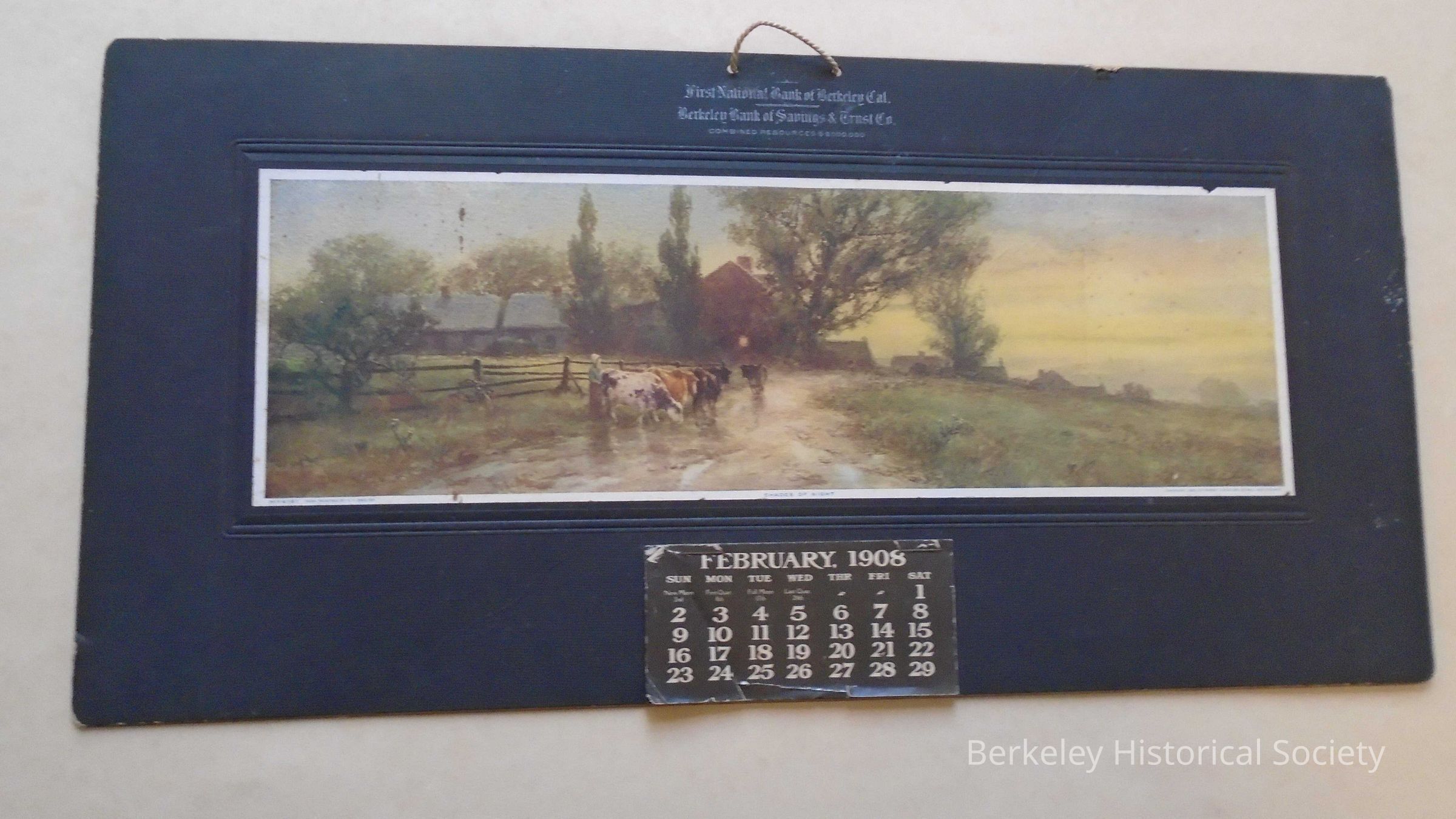 Cardboard and paper hanging calendar. Picture in the middle from a painting by F.F. English shows cows and peasant woman in a pastoral scene, houses in the background. Text at the top: "First National Bank of Berkeley Cal Berkeley Bank of Savings & Trust Co. Combined resources $6,000,000". Calendar is stapled on the bottom in center and has a page for each month to tear off. Top month is February 1908. Backing and calendar are black, with white text. Twine loop at top for hanging.Lexicon