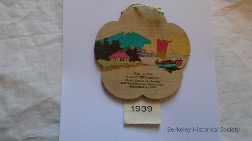 Wood and paper calendar from 1939 advertising San Pablo Florist and Nursery, 1806 San Pablo Ave., Berkeley, Calif. Phone BErkeley 7756. Picture of Japanese house and junk with Mt. Fuji in background on a wood shaped flower, with paper calendar for months in 1939 glued on bottom. "Made in Japan" stamped on back. Ribbon on top for hanging.