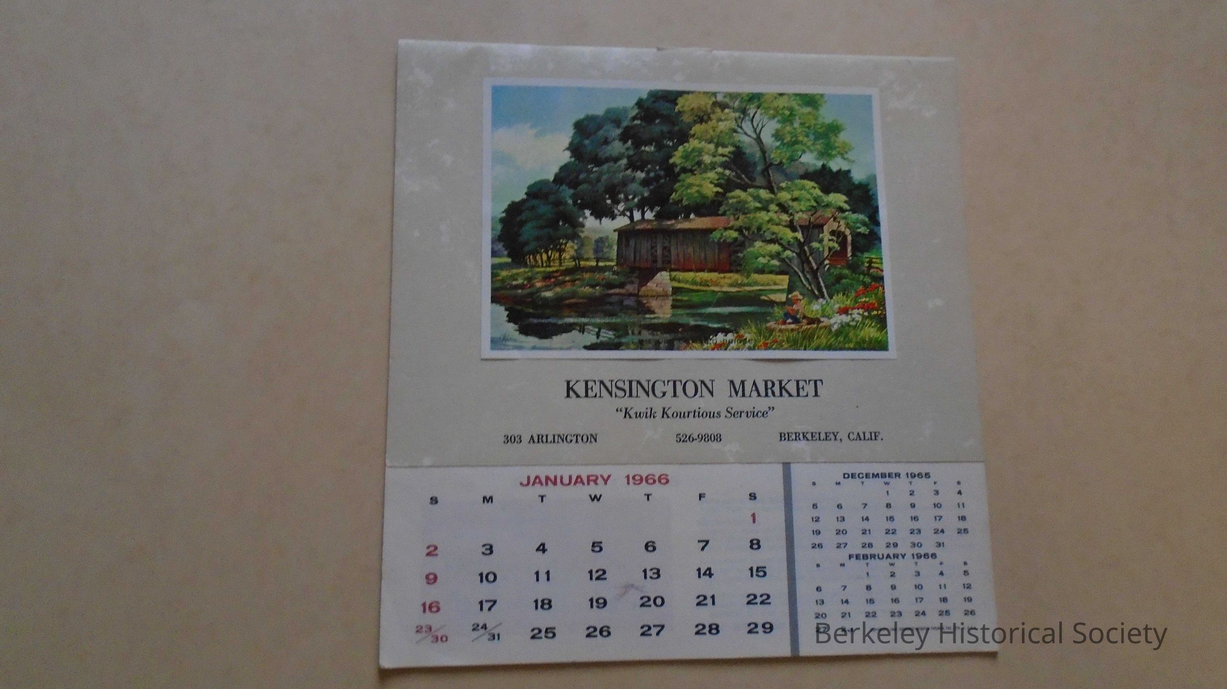 Paper and cardboard hanging calendar. Cover shows picture of a covered bridge in the country and below it, text advertising "KENSINGTON MARKET Kwik Kourtious Service 303 Arlington 526-9808 Berkeley, Calif. " Opens to a page for each month with tips for house and yard maintenance on the top, backside of previous page. First month is January 1966. On the back of the calendar are 2 "his and her" wallet 1966 calendars to tear out. Calendar is grey and white, the picture multi-colored.Made/Created