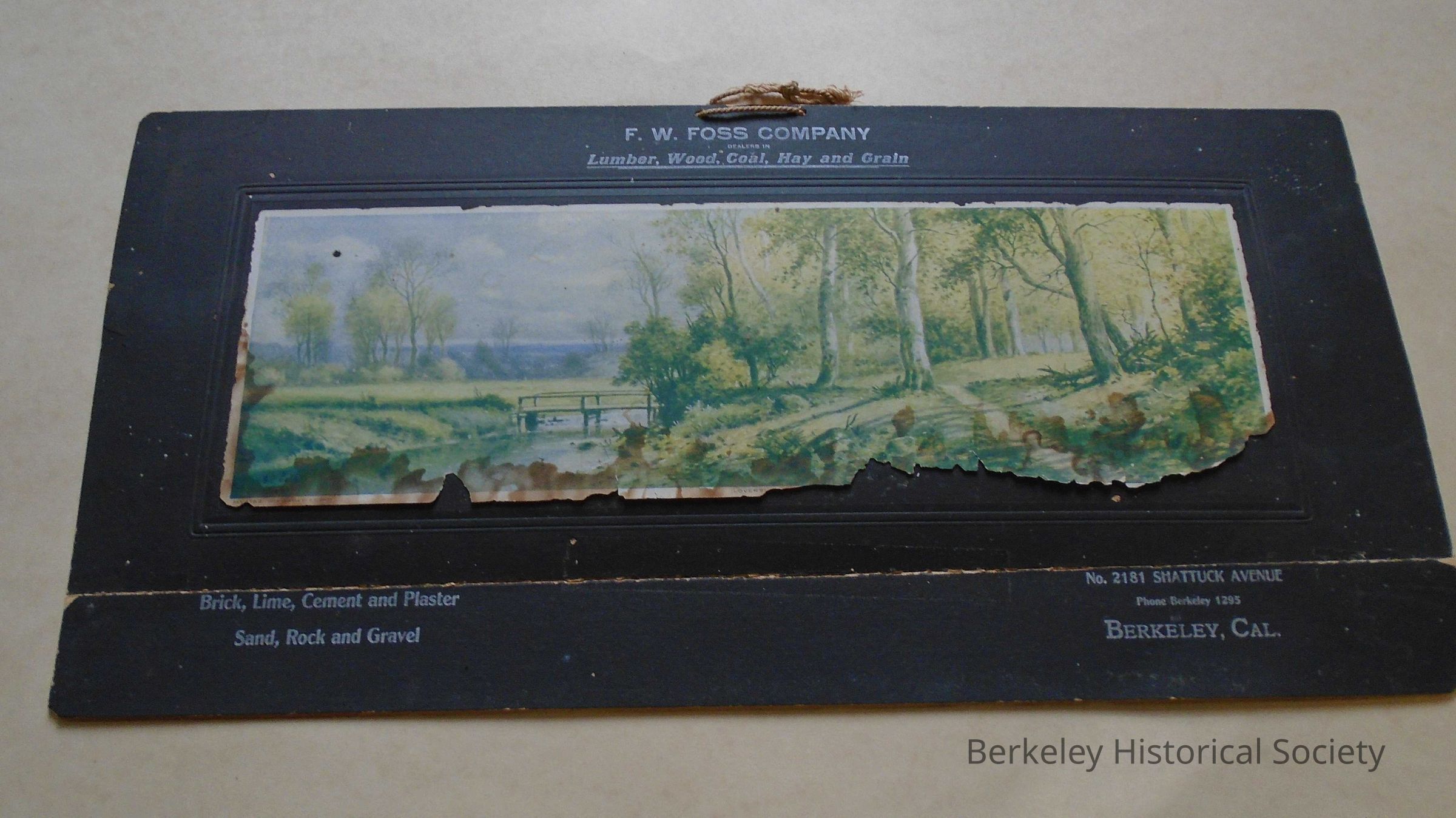 Cardboard and paper backboard for a calendar. Picture in middle from a painting by G.F. Colby of a footbridge over a creek in a pastoral scene. Text at the top: "F.W. FOSS COMPANY dealer in Lumber, Wood, Coal, Hay and Grain." Text at bottom: "Brick, Lime, Cement and Plaster Sand, Rock and Gravel No. 2181 Shattuck Avenue Phone Berkeley 1295 Berkeley, Cal." Backboard is black with white text. Staple holes where a small calendar is missing. Twine loop at top for hanging.Made/Created