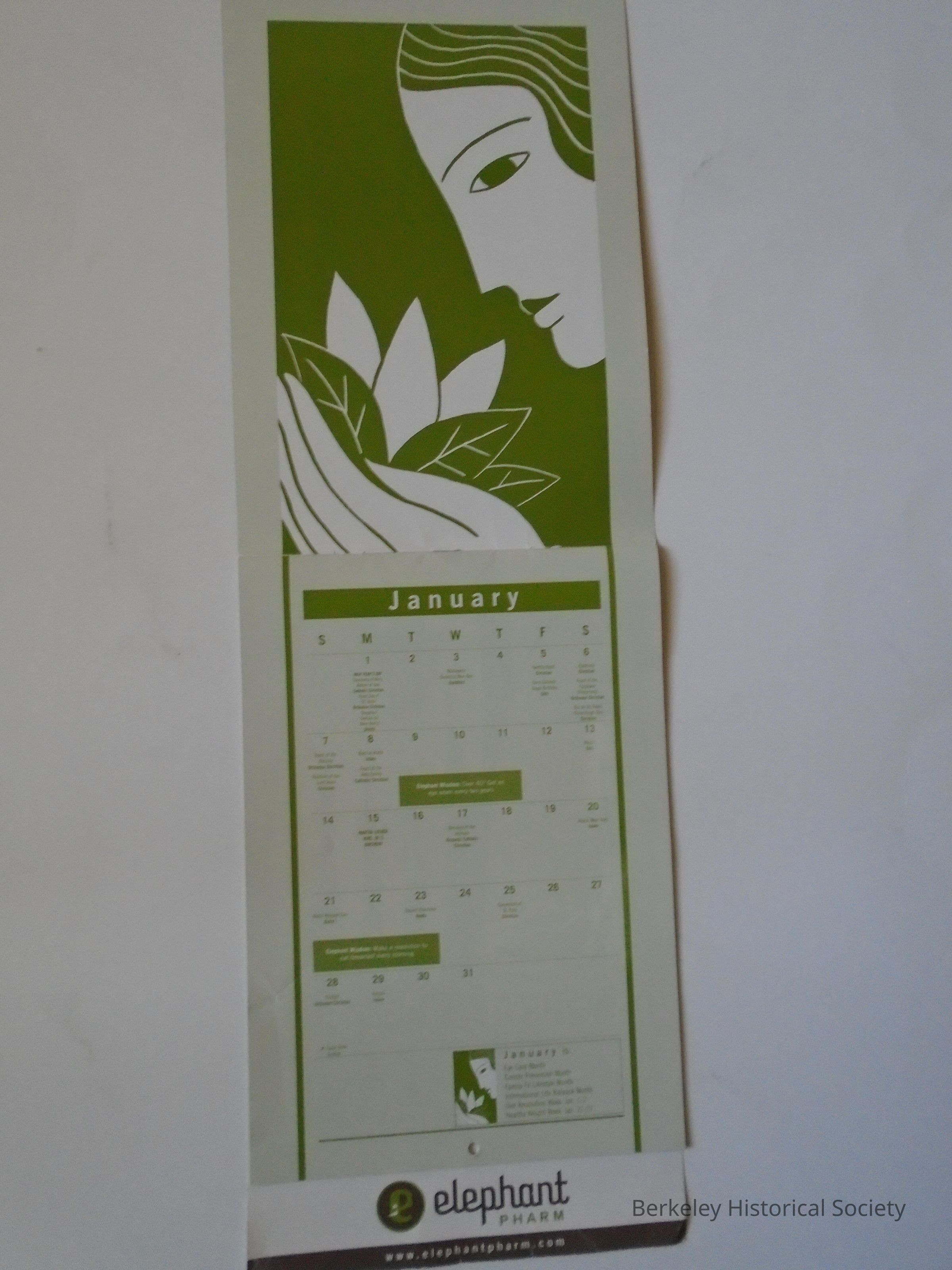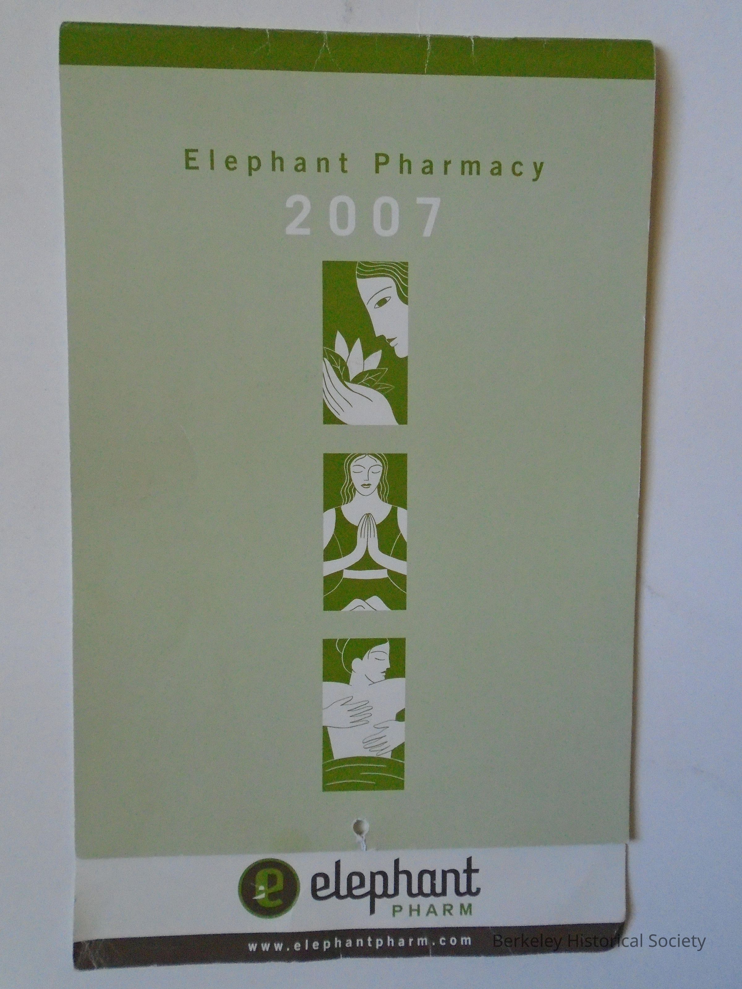 Elephant Pharmacy 2007 paper calendar. Green and white. A small green pharmacy, located at 1607 Shattuck Ave. in North Berkeley (2002-2009). www.elephantpharm.com