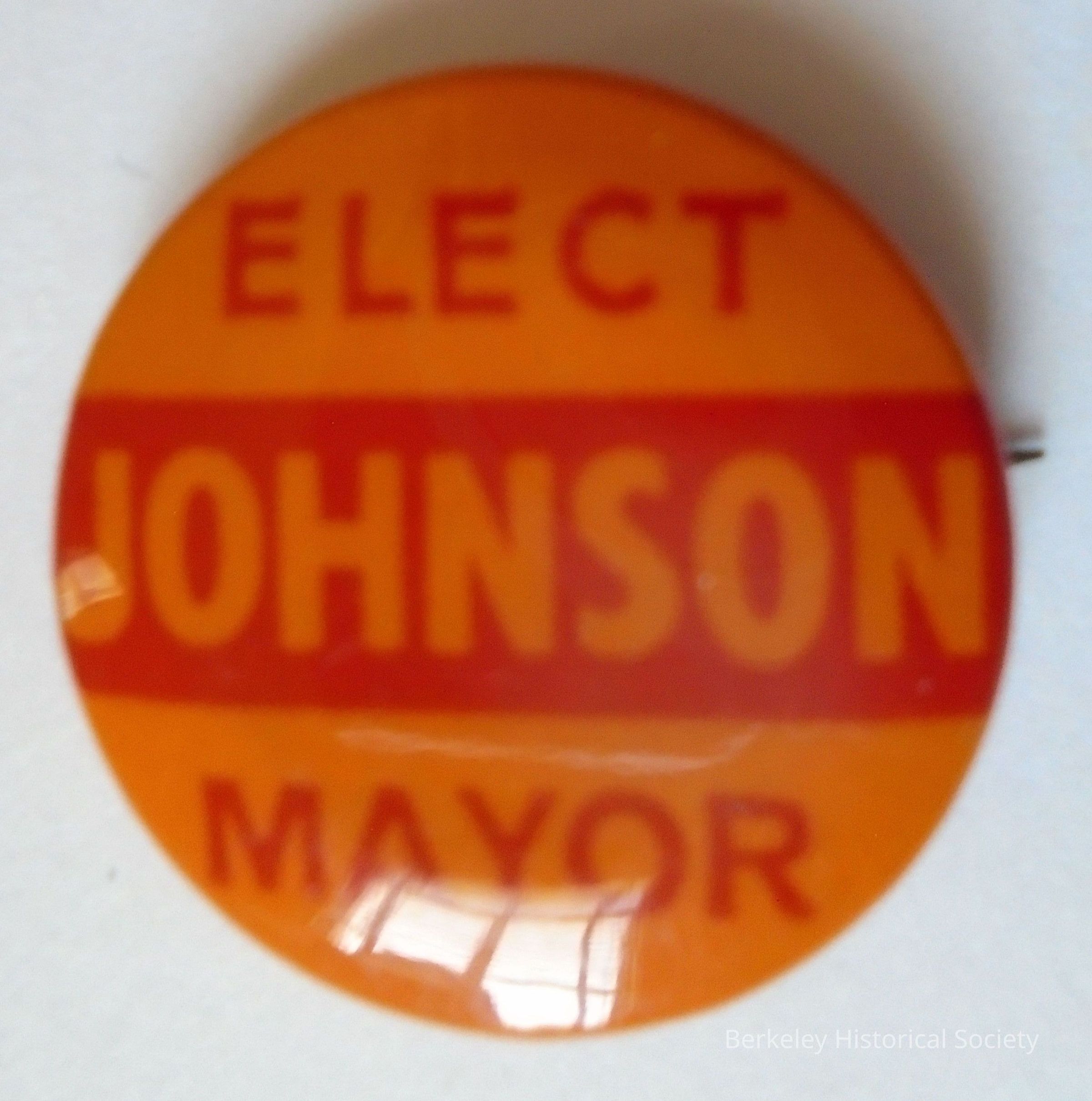 Round metal button with paper and plastic front, metal back and pin. Orange and red text and background: ELECT JOHNSON MAYOR. (Elect mayor in red on orange and Johnson in orange on red). Wallace Johnson was mayor 1963-1971. Republican, political maverick, supported an important land-use decision in the early 60's --supported a bond issue to keep the Berkeley BART line underground (it would thus not visibly divide East and West Berkeley). BART Director 1967-70.