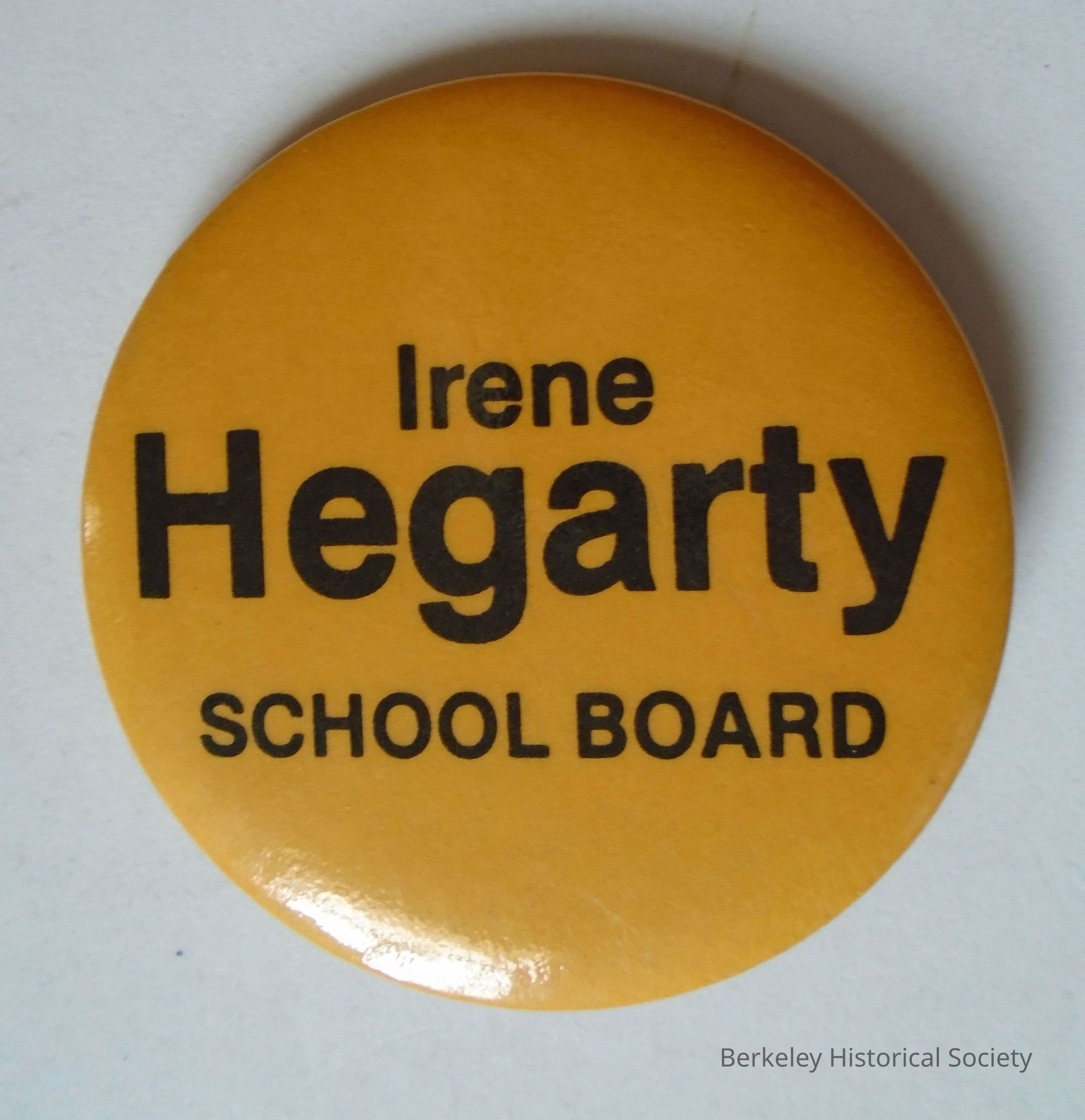 Round, flat, metal button with pin on back. Yellow/gold background with black text: "Irene Hegarty SCHOOL BOARD".
