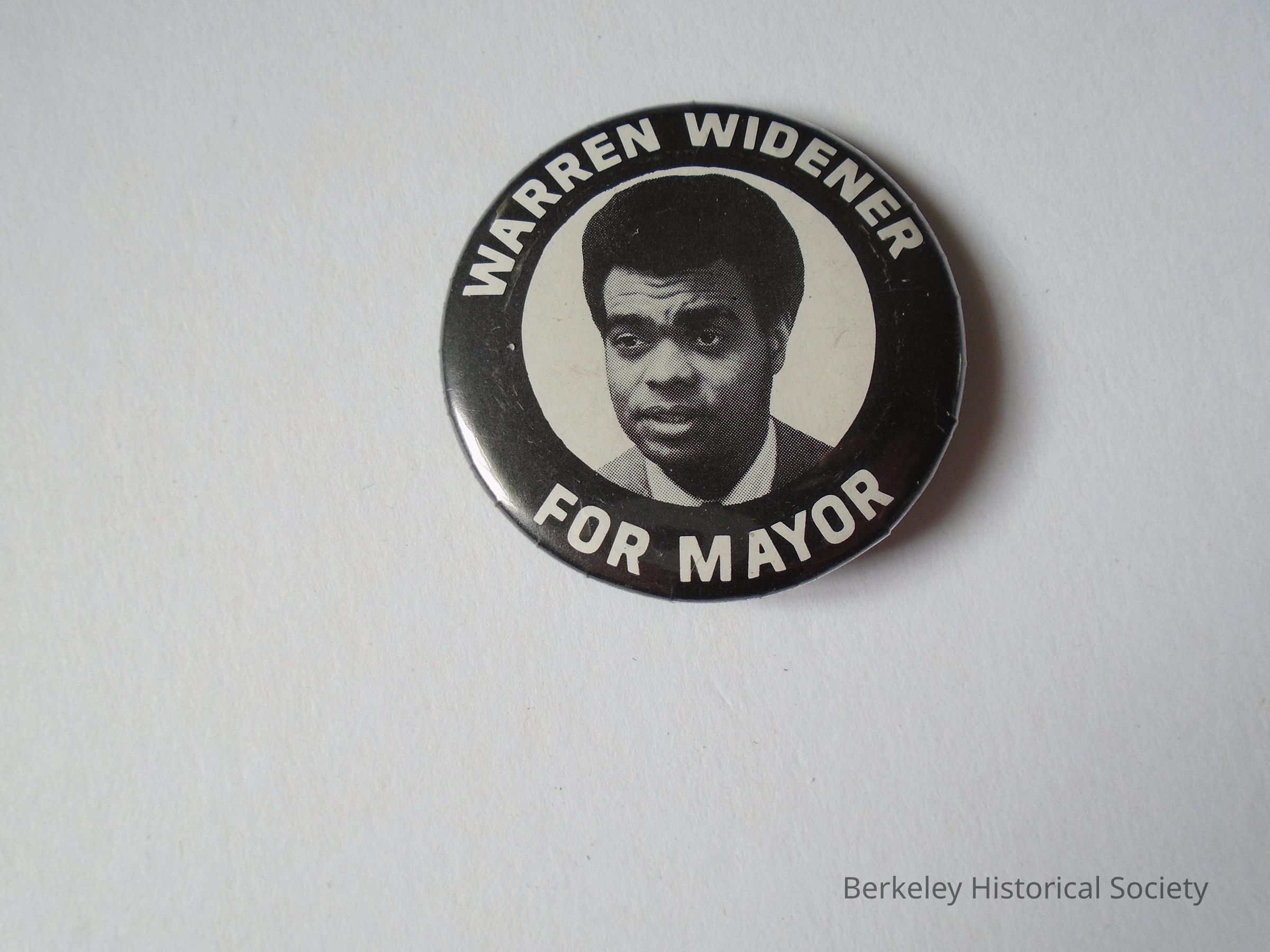 Round metal campaign button. Black background with white text: "WARREN WIDENER FOR MAYOR", encircling a picture of Widener in a white background. Campaign button in Berkeley elections. Served on City Council 1969, mayor 1971-1979. Liberal Democrat, first black mayor. 3 identical buttons.