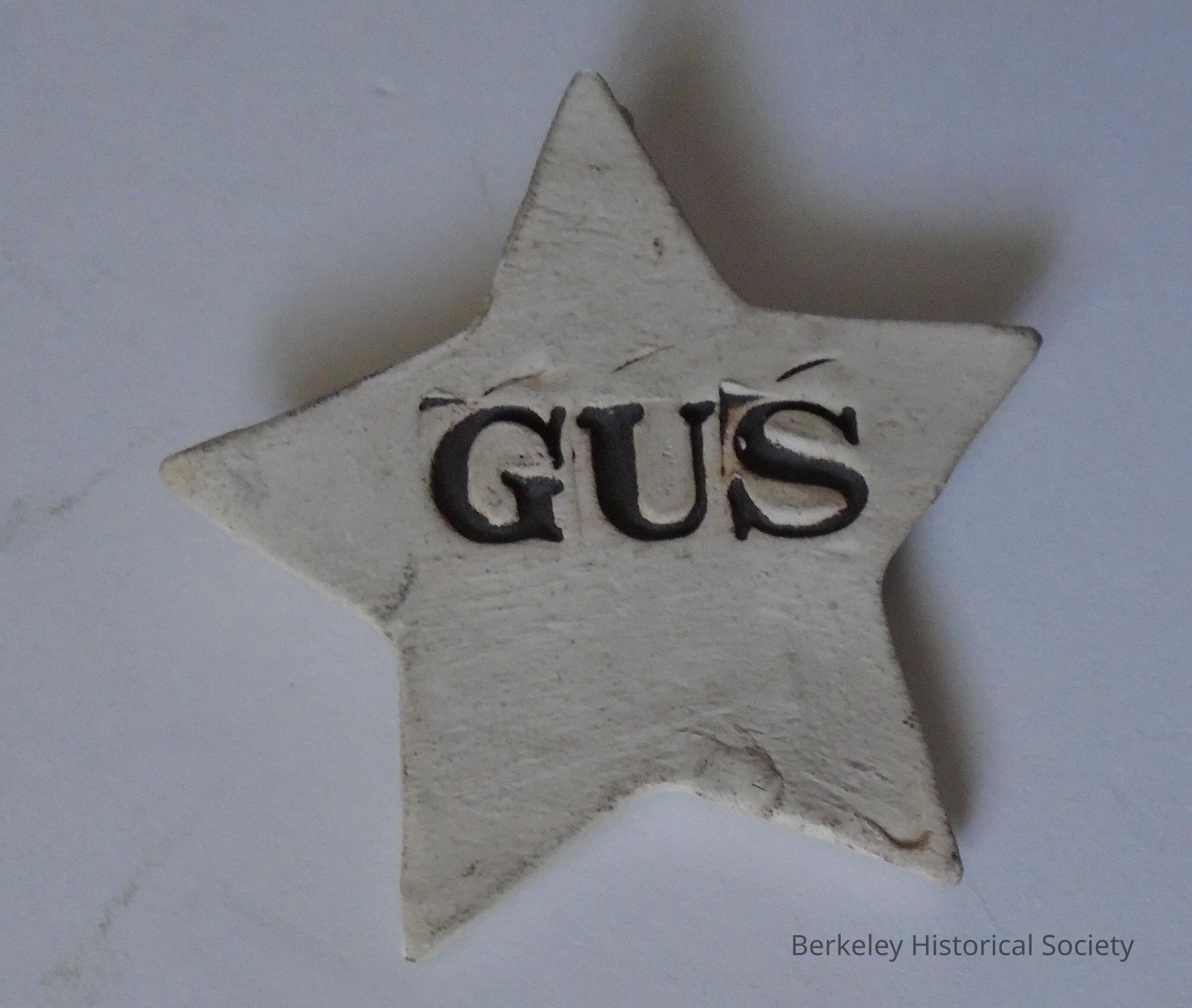 Clay campaign button in the shape of a star: "GUS." Campaign button for Eugene (Gus) Newport who served as mayor 1979-1986. Button probably made by Julius Seitz. Gus Newport had the backing of Berkeley Citizens Action—progressives, radicals and reformers. He had ties to the Socialist Workers Party and Communist Party. He went on to serve as U.S. Peace Council Co-Chairperson 1983-85 and was elected honorary chair of Democratic Socialists of America in 1999. He spoke at the Conference on Perspectives for Democracy and Socialism (held in 1992 in Berkeley). He was active in the Progressive Alliance of Alameda Co. (1996-), the anti-Iraq war movement (2002-), Free Mumia Abu-Jamal (2008-) and many other organizations.