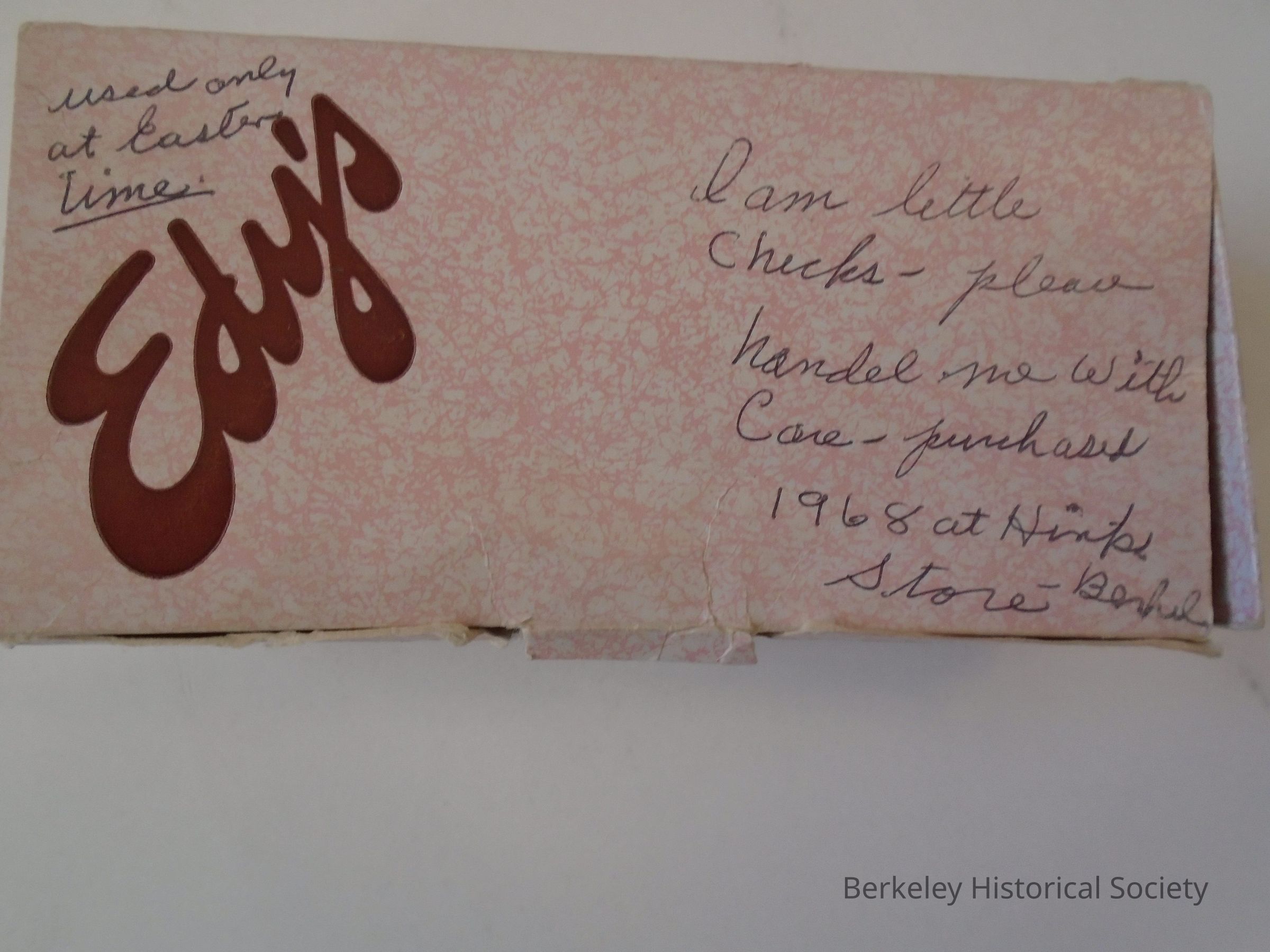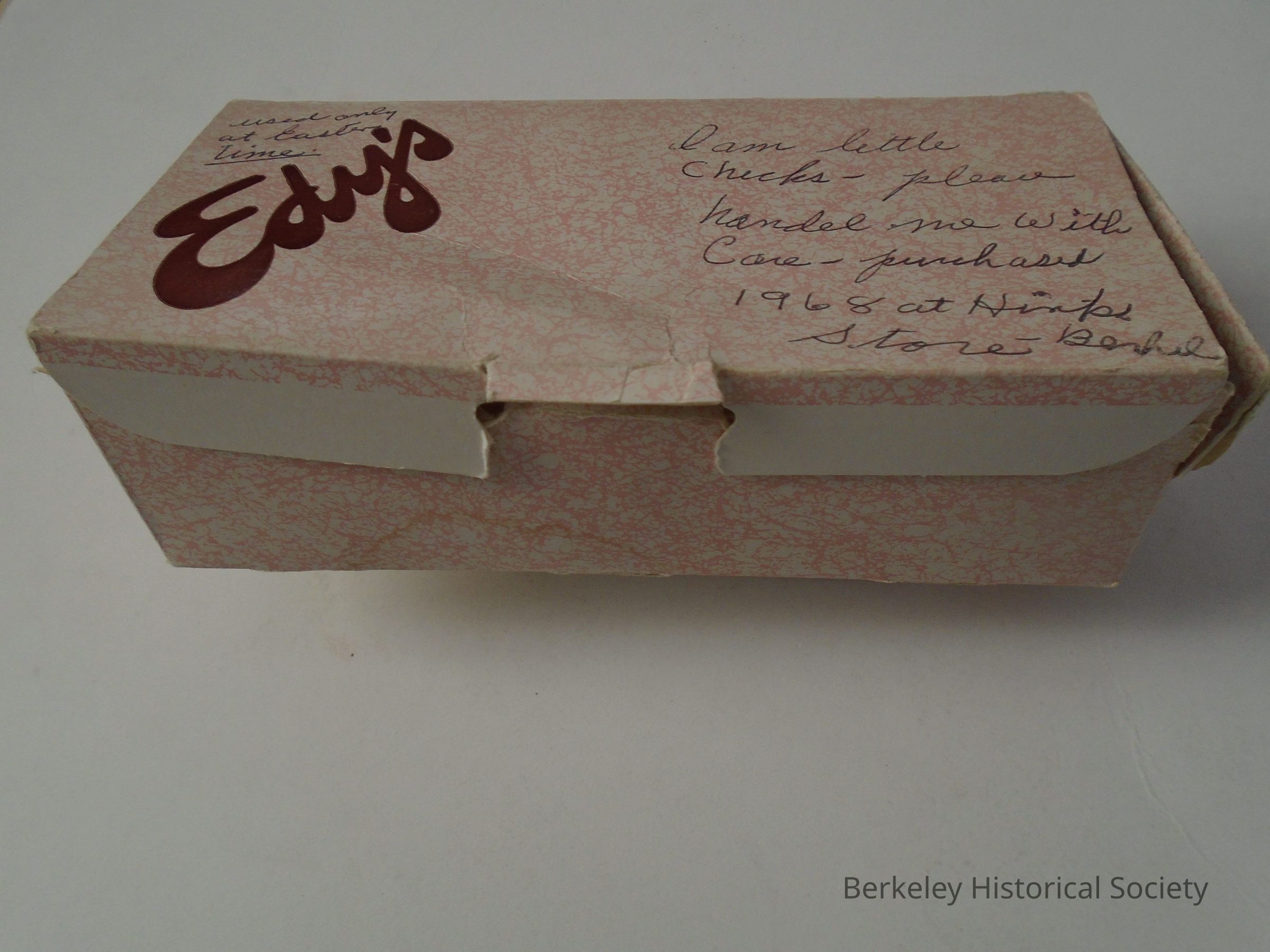 Cardboard box from Edy's (candy and ice cream store on Shattuck Ave.). Pink with brown text and attached lid. Handwritten note on top.