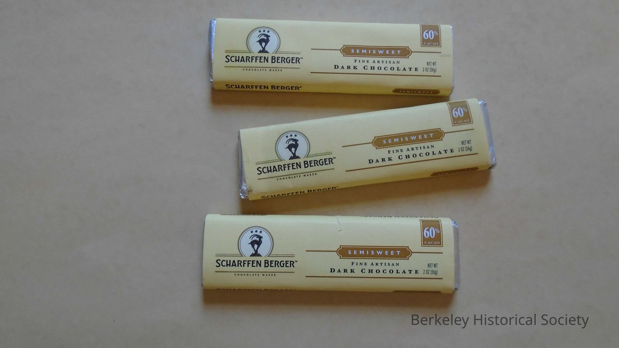 3 identical paper Scharffen Berger chocolate bar wrappers, wrapped around wood blocks (for display). "Semisweet fine artisan dark chocolate, mfg. in Berkeley, CA 94710". Now a division of Artisan Confections Company (Hersey's). Brown and yellow with logo of mountain sheep.Lexicon