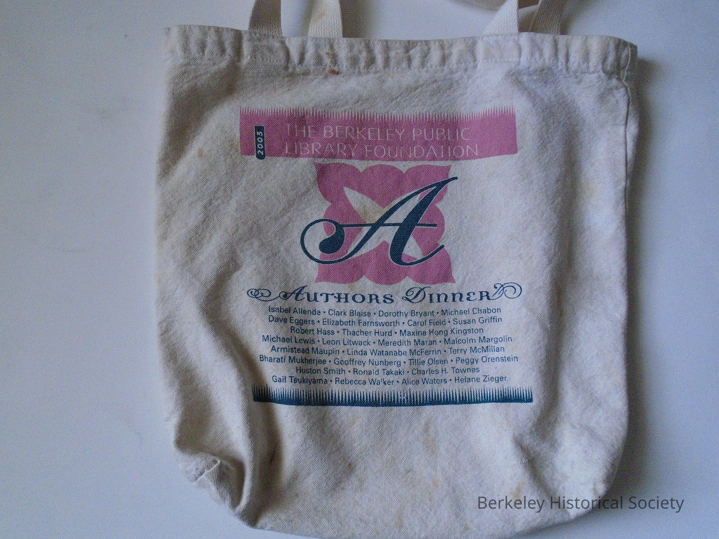 Canvas bag from The Berkeley Public Library Foundation Author's Dinner. Shows pink and black text/logo and underneath lists authors "celebrated". Label inside shows: Save a Tree, 100% cotton, Handsewn in U.S.A., PO Box 862, Berkeley, Ca, 94701.Dimensions
