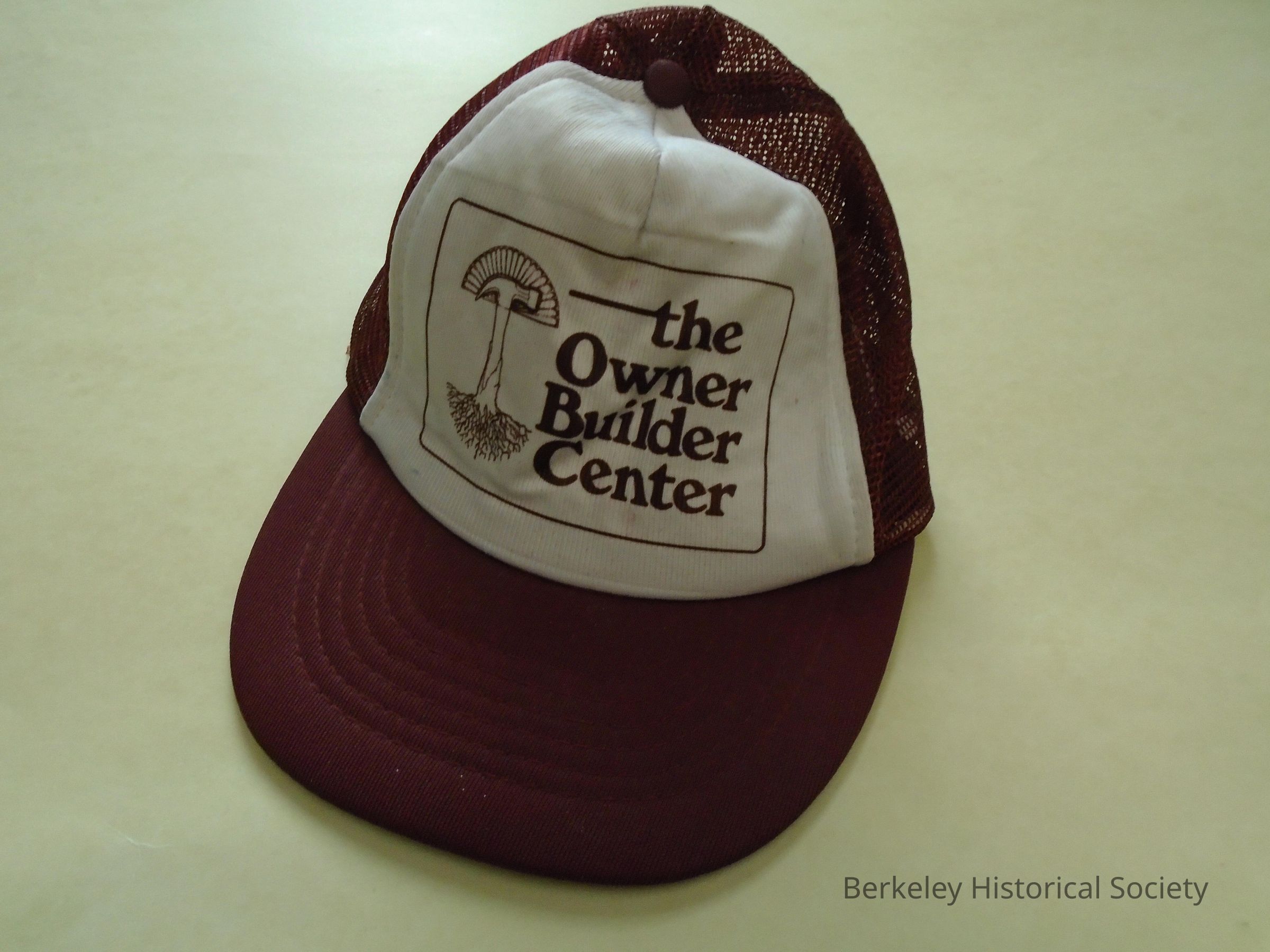 Brown and beige, cotton and synthetic, baseball cap. Back part is net. Plastic closure tab is broken. Picture of a hammer and "the Owner Builder Center" in front. The Owner Builder Center was founded in early 1970's and in 1992 became the Building Education Center. Located at 812 Page St.