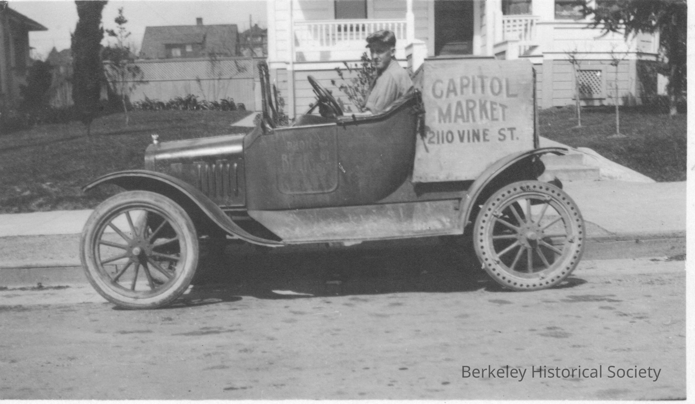 Box with name of market on back of Model T. Capitol Market 2110 Vine St. painted on box, but car in front of residential house. Ralph Sewell driving car.
