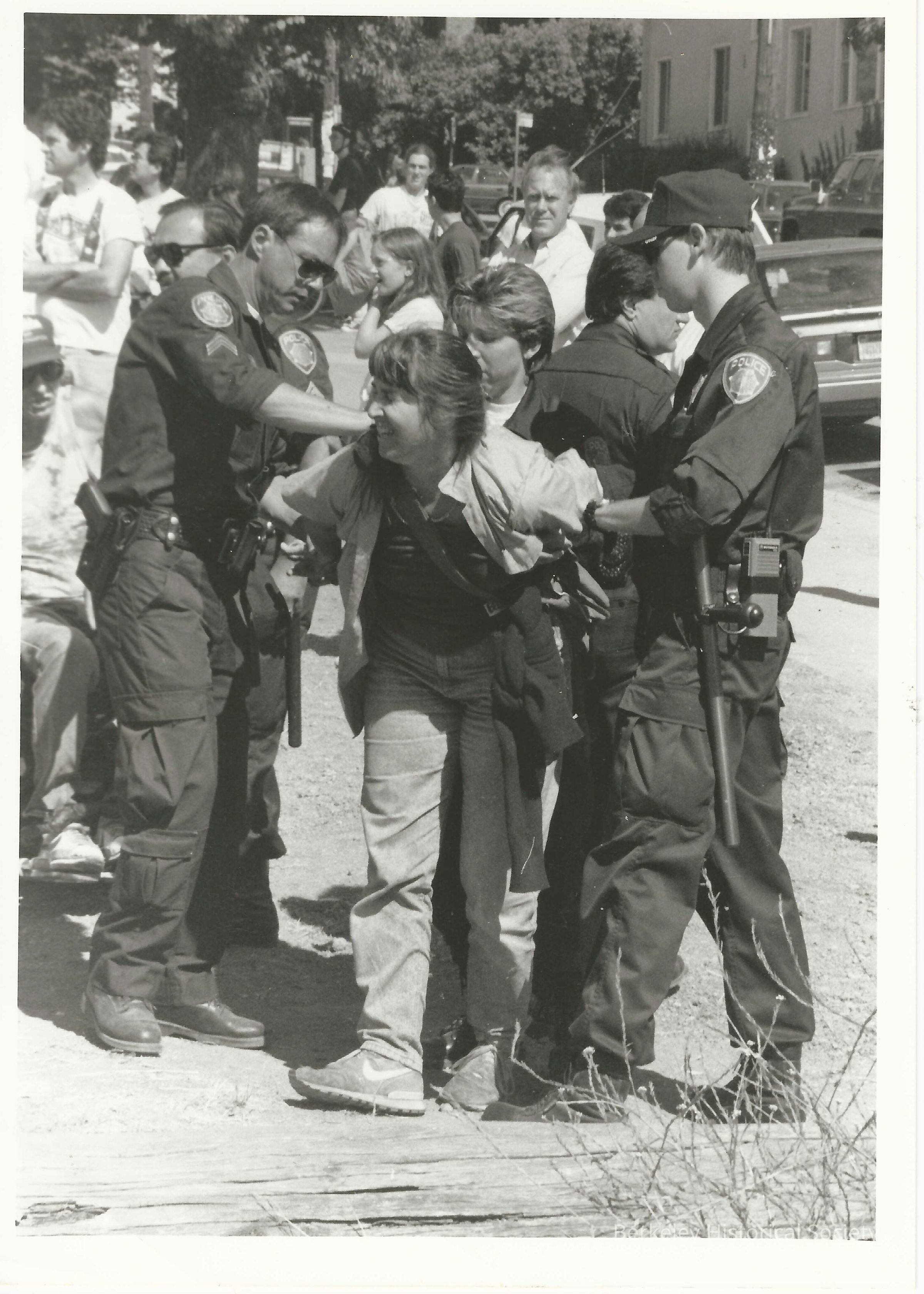 3 photos. One playing guitar; one being arrested at People's Park