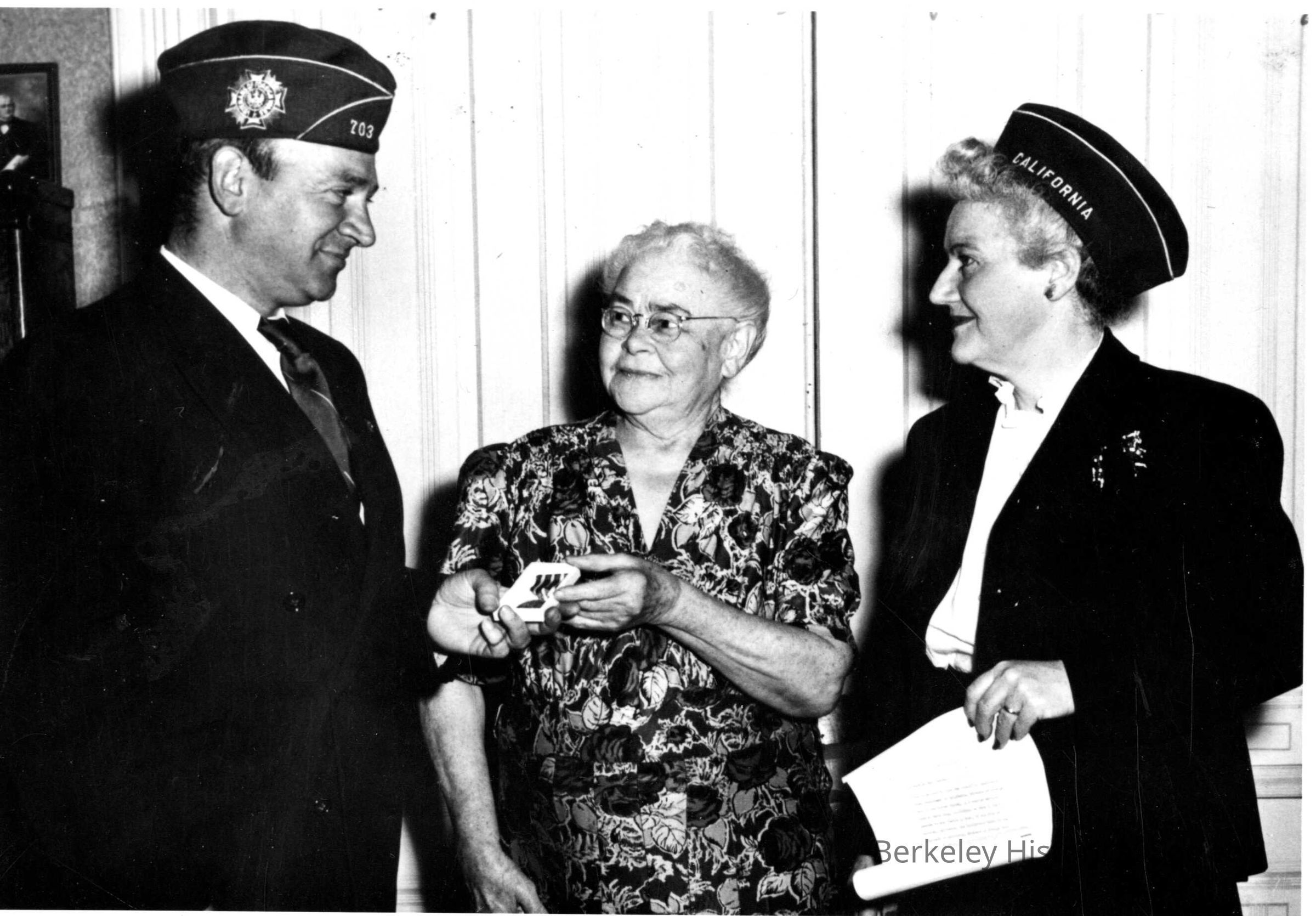 Hoyt receiving award for outstanding patriotism. Award given by Harvey Dixon and Mildred Mills, president to auxiliary to Veterans of Foreign Wars. June 9, 1947Lexicon