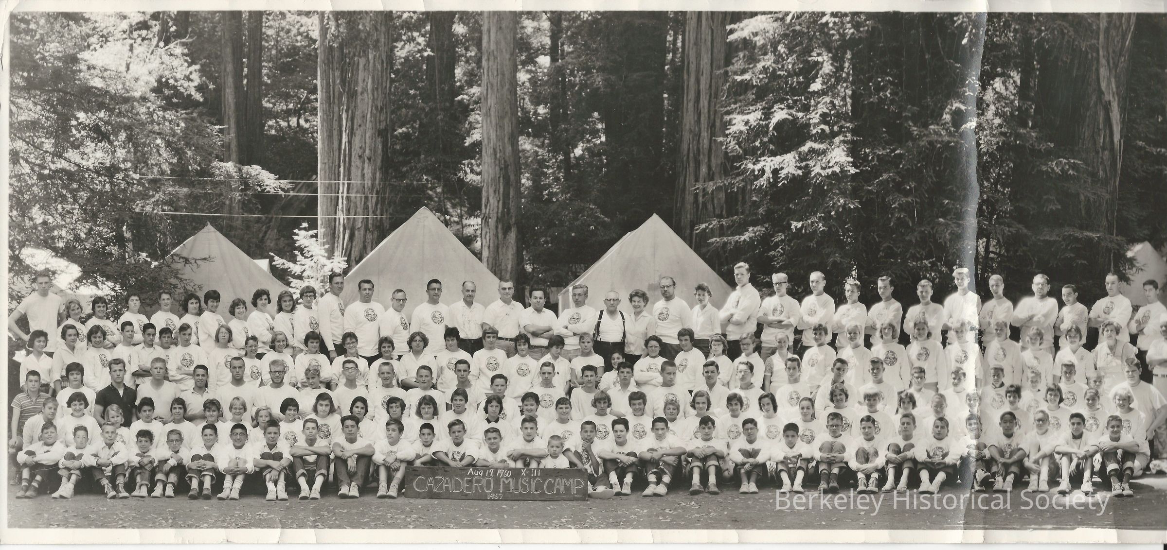 Panorama format photograph of attendees anjd staff of the camp. Wooden sign in front has date 1957 carved in but writing above that says Aug. 17, 1960.Other Names and Numbers