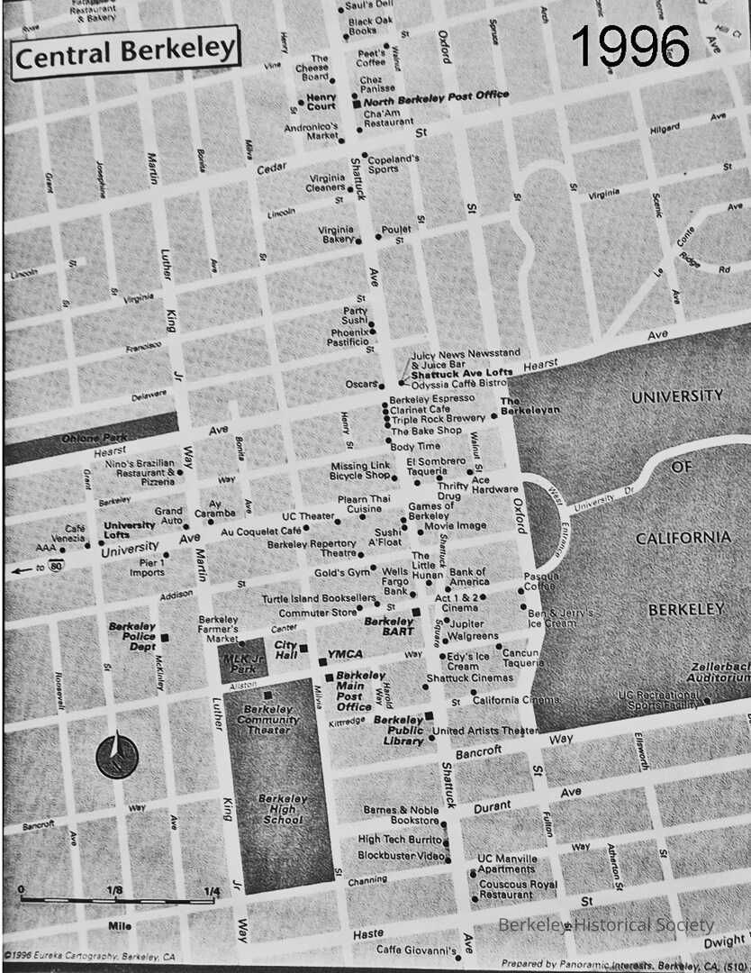 Maps showing business on Shattuck from Haste to Vine. Prepared by Panoramic Interests, Eureka Cartography