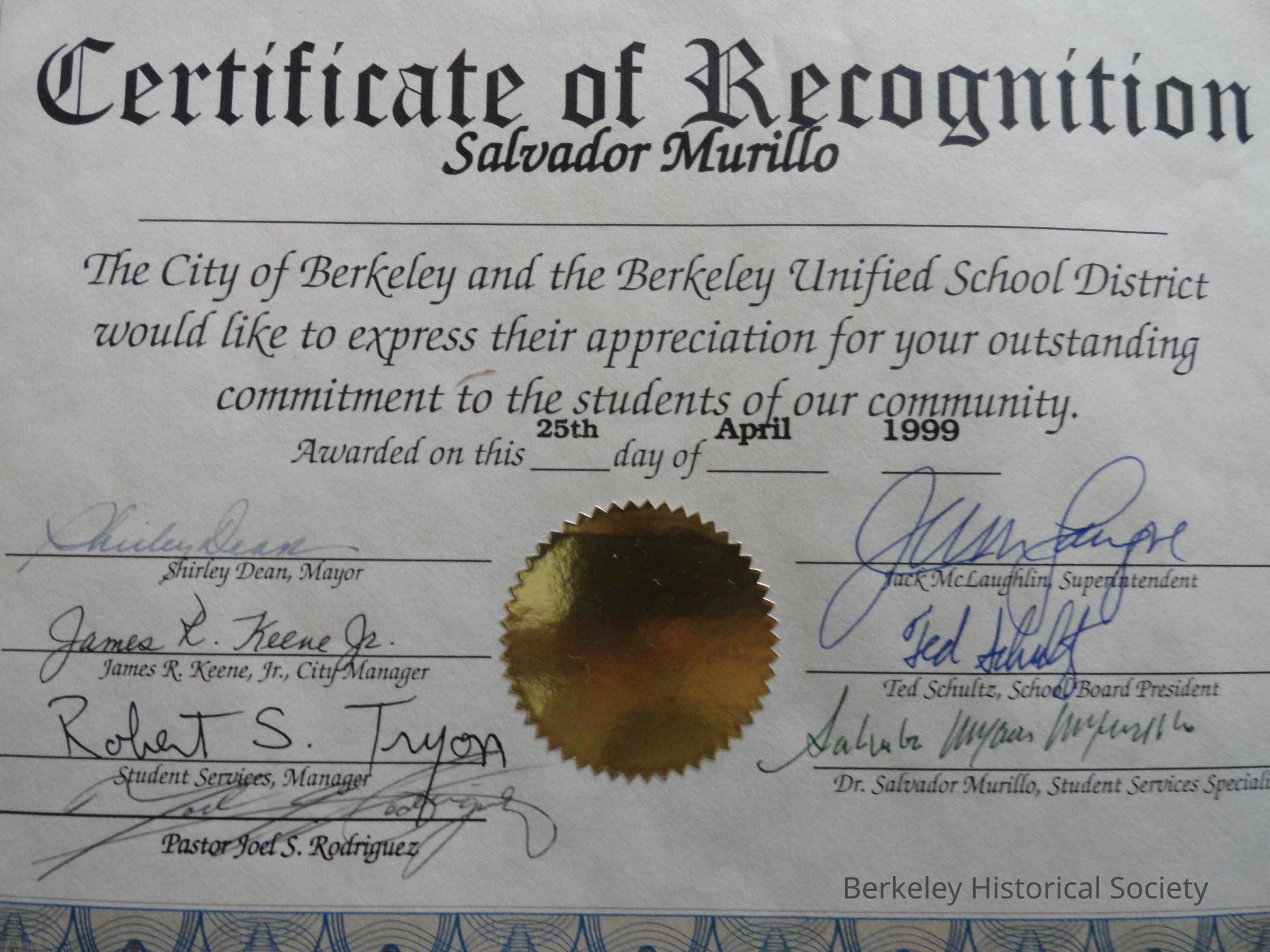 Certificate of recognition for 'outstanding commitment to the students of our community.' from the City of Berkeley and the Berkeley Unified School District.