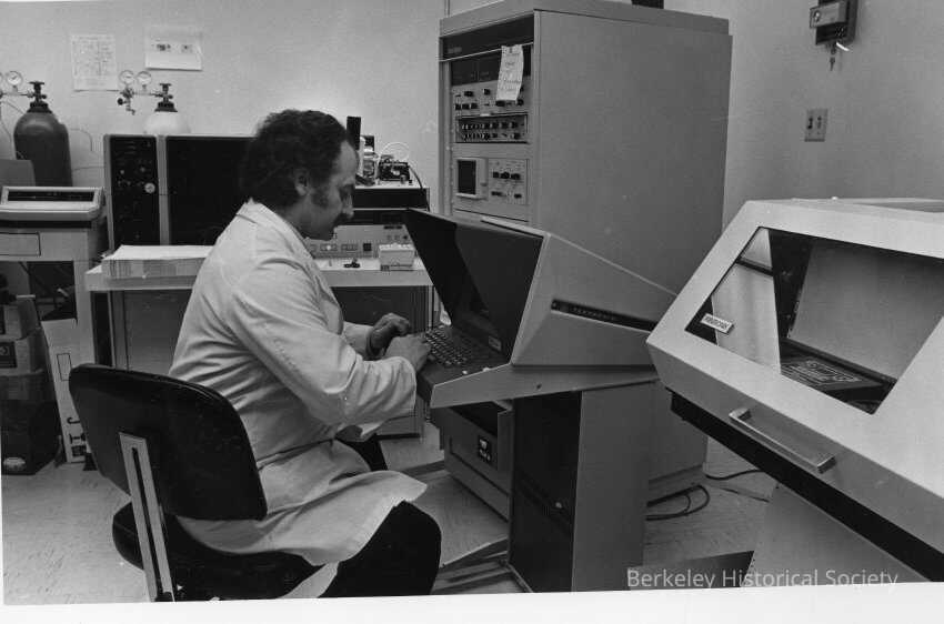 Demetrios Dalietos with a mass spectrometer and computer. 600 Bancroft Way.