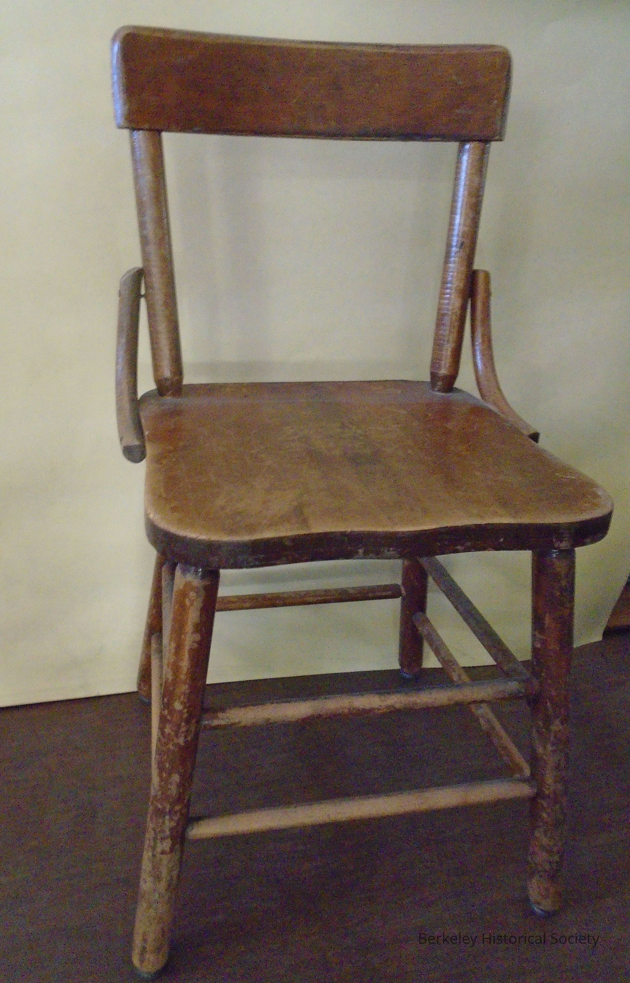 Child sized, wooden straight- back chair. Four round dowel legs with two dowel rungs on each side. Seat is flat wood with indentions on the front for legs. Back is 2 dowels supporting a curved wooden strip, no rungs. Pieces of bent wood secure the back to the seat. On bottom: ink "BUSD 76 15" , Red and yellow sticker: "Berkeley Unified School District 7746," black and white sticker with school district name and "308137". Used in a Berkeley school.Lexicon