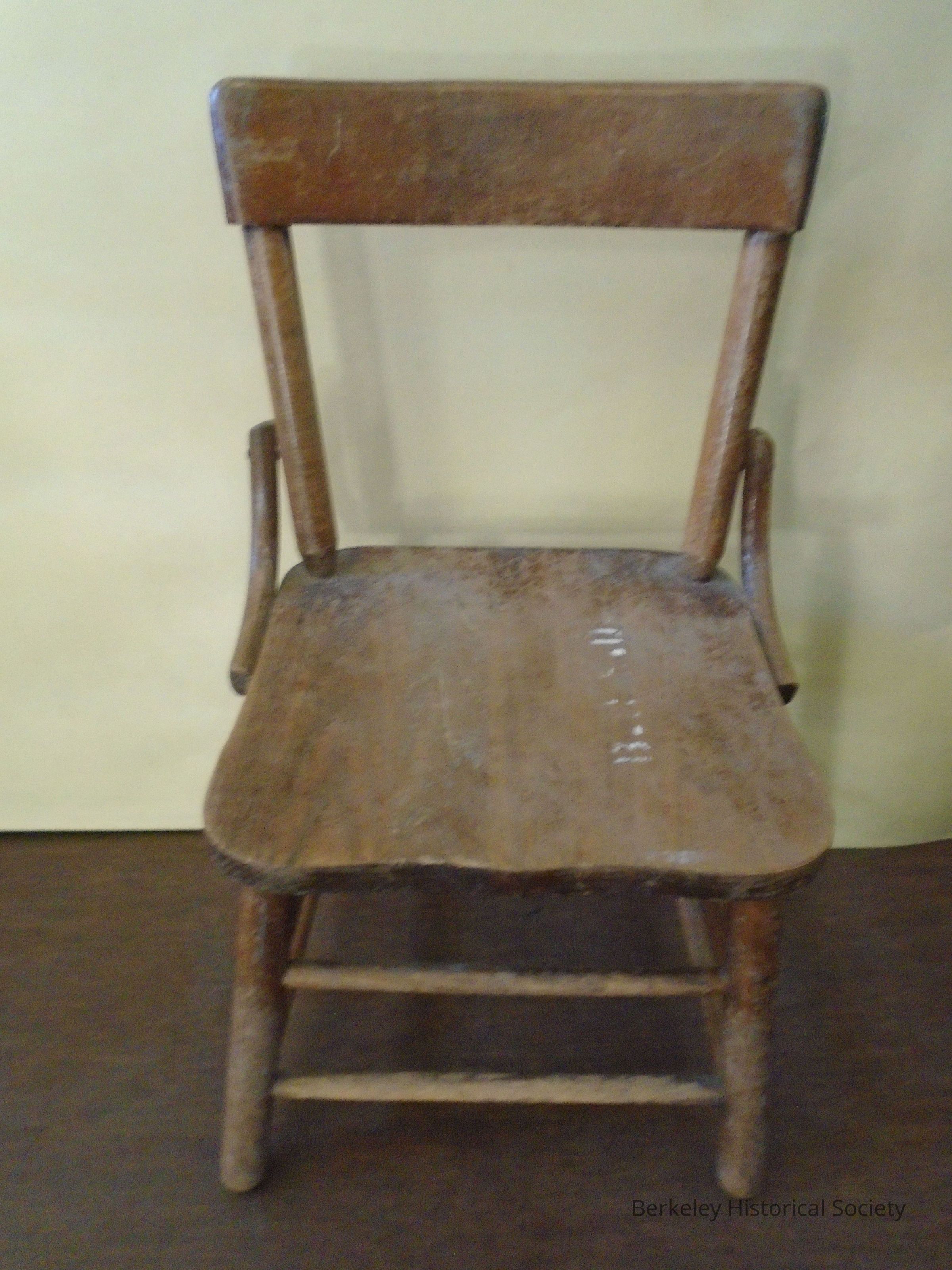 Child sized, wooden straight- back chair. Four round dowel legs with two dowel rungs on each side. Seat is flat wood. Back is 2 dowels supporting a curved wooden strip, no rungs. Two pieces of bent wood secures the back to the seat. Sticker on bottom:: "Berkeley Unified School District 069544." Illegible white stencil on top of seat. Used in a Berkeley school.