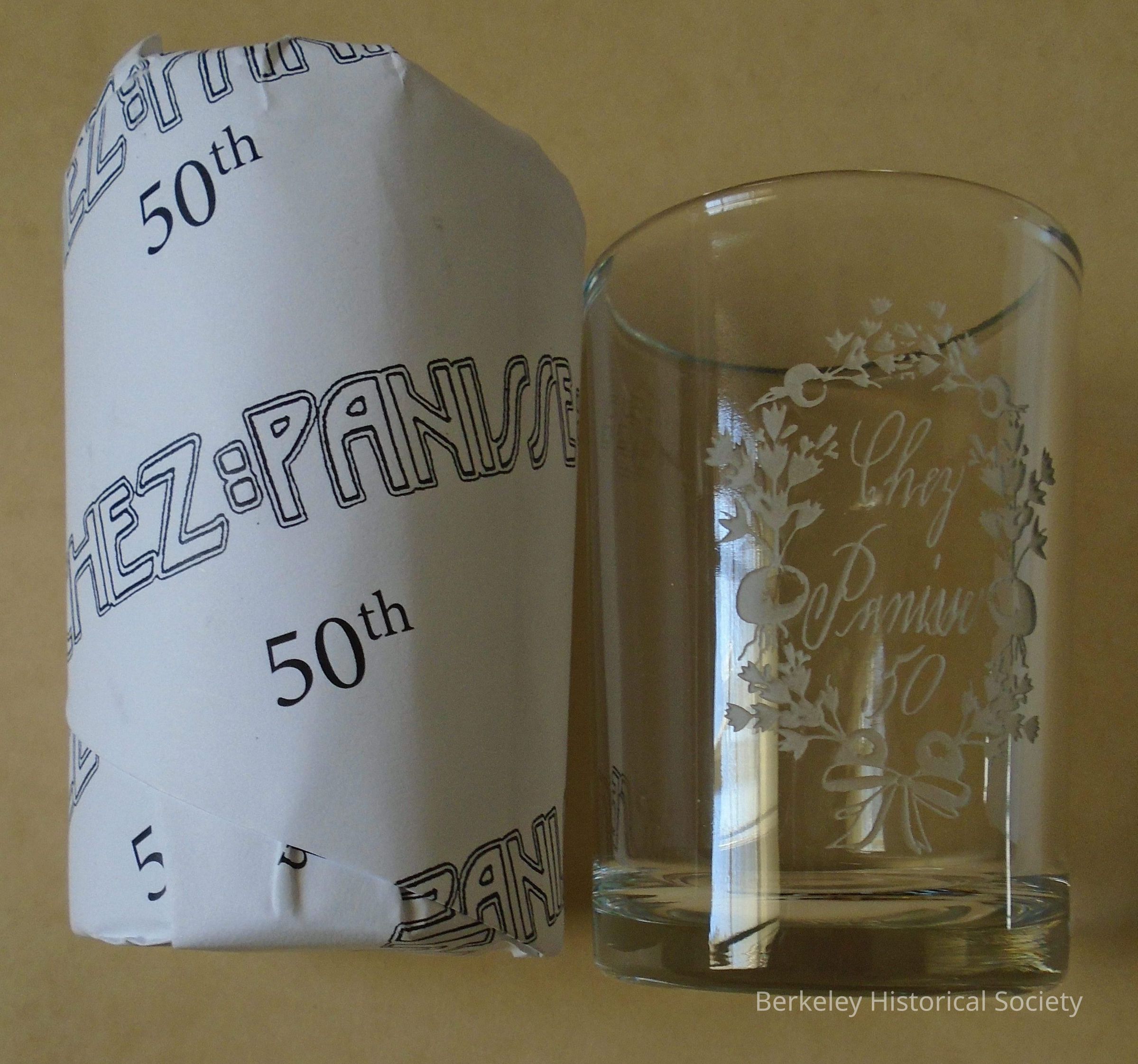 Water glass created for Chez Panisse's 50th anniversary. 1 of 2, the second still in the original paper wrap. See 2022.34.2