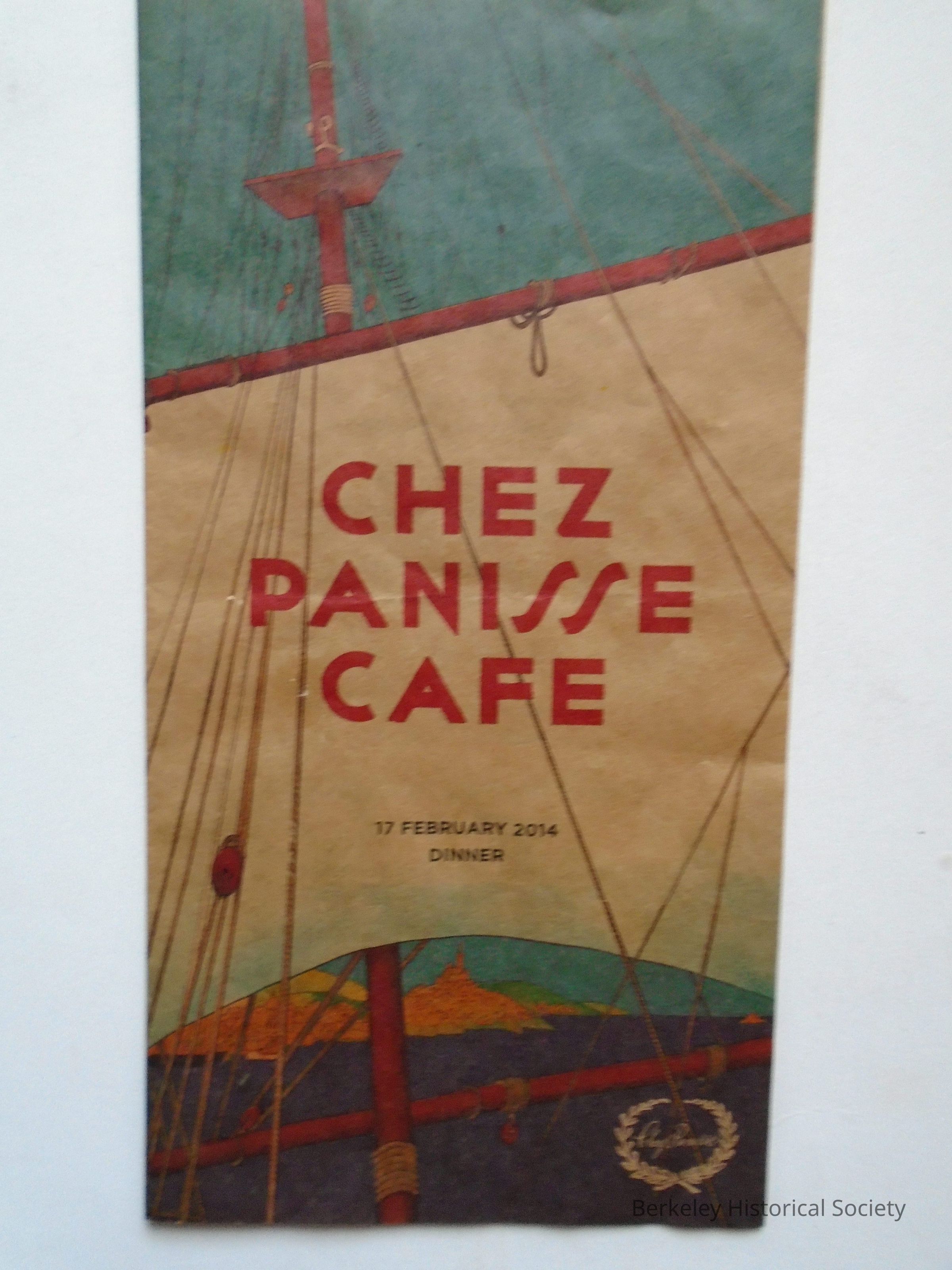 Chez Panisse Cafe paper menu for 17 February 2014, Dinner. Folded in thirds. Front shows the sail of a ship with San Francisco in background.Dimensions