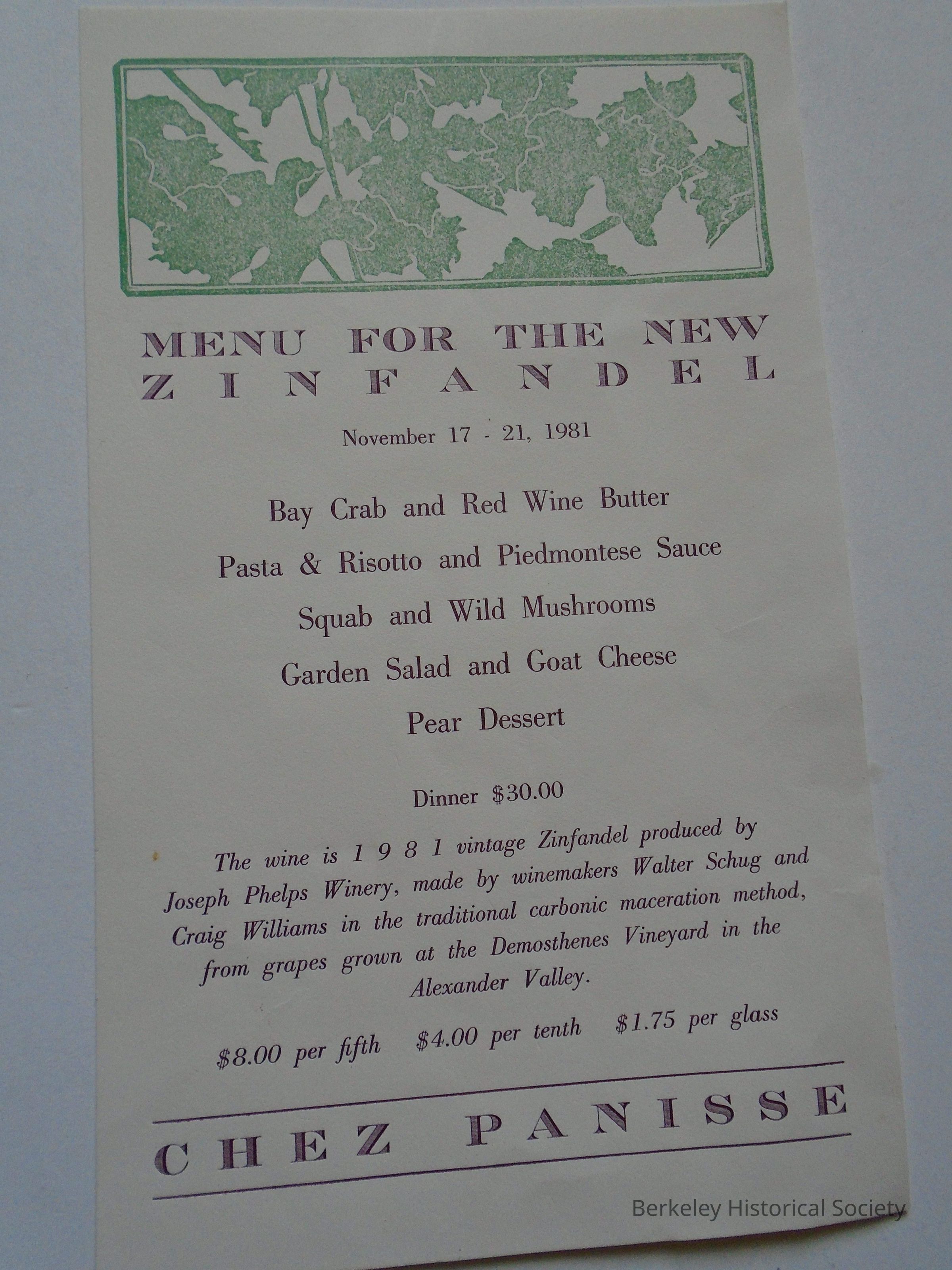 Chez Panisse paper menu for the new zinfandel November 17-21, 1981.
