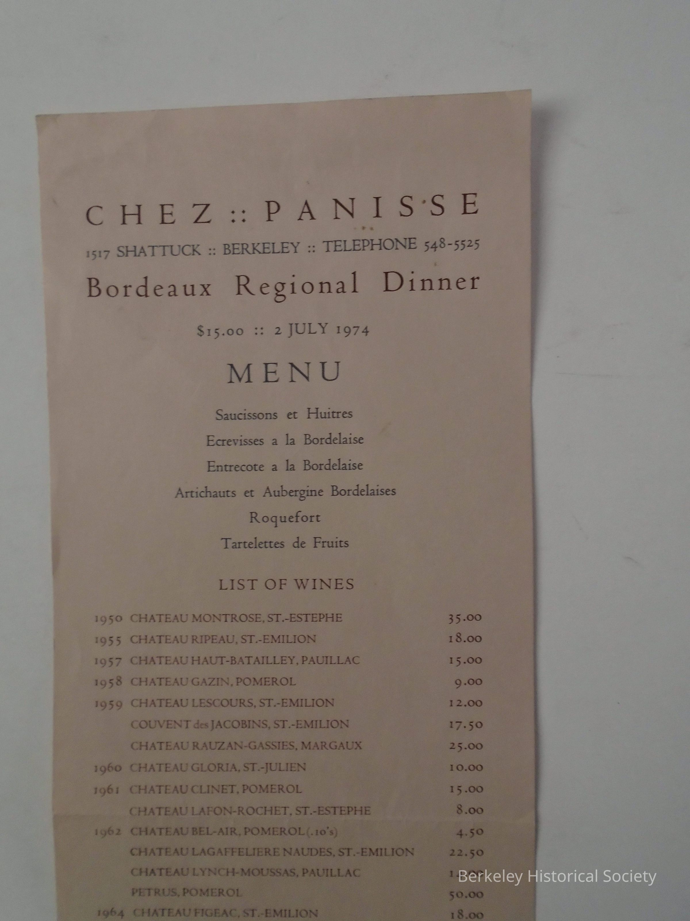 Paper Chez Panisse menu: Bordeaux Regional Dinner July 2, 1974.