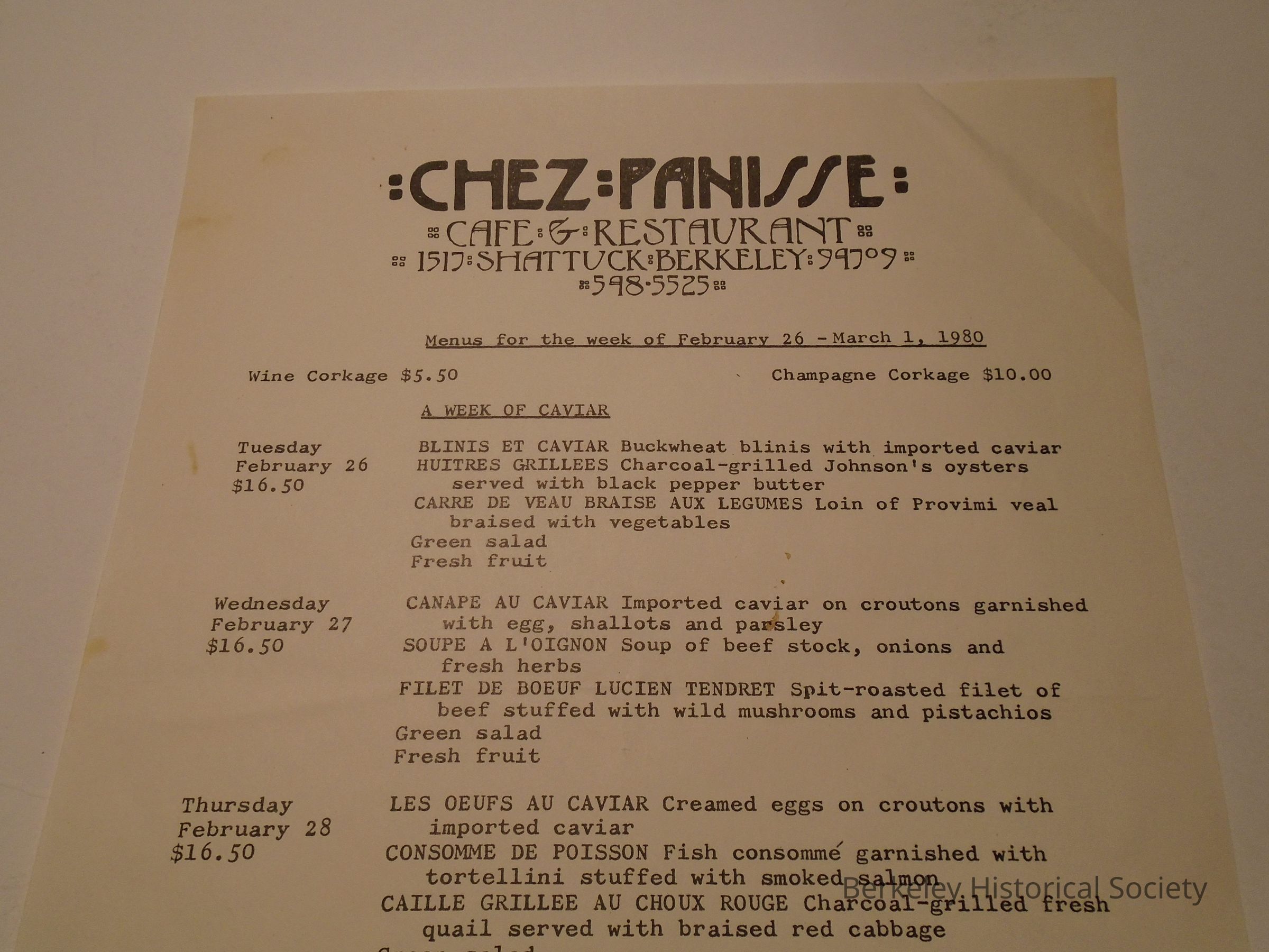 Chez Panisse paper menu for the week of February 26 - March 1, 1980.