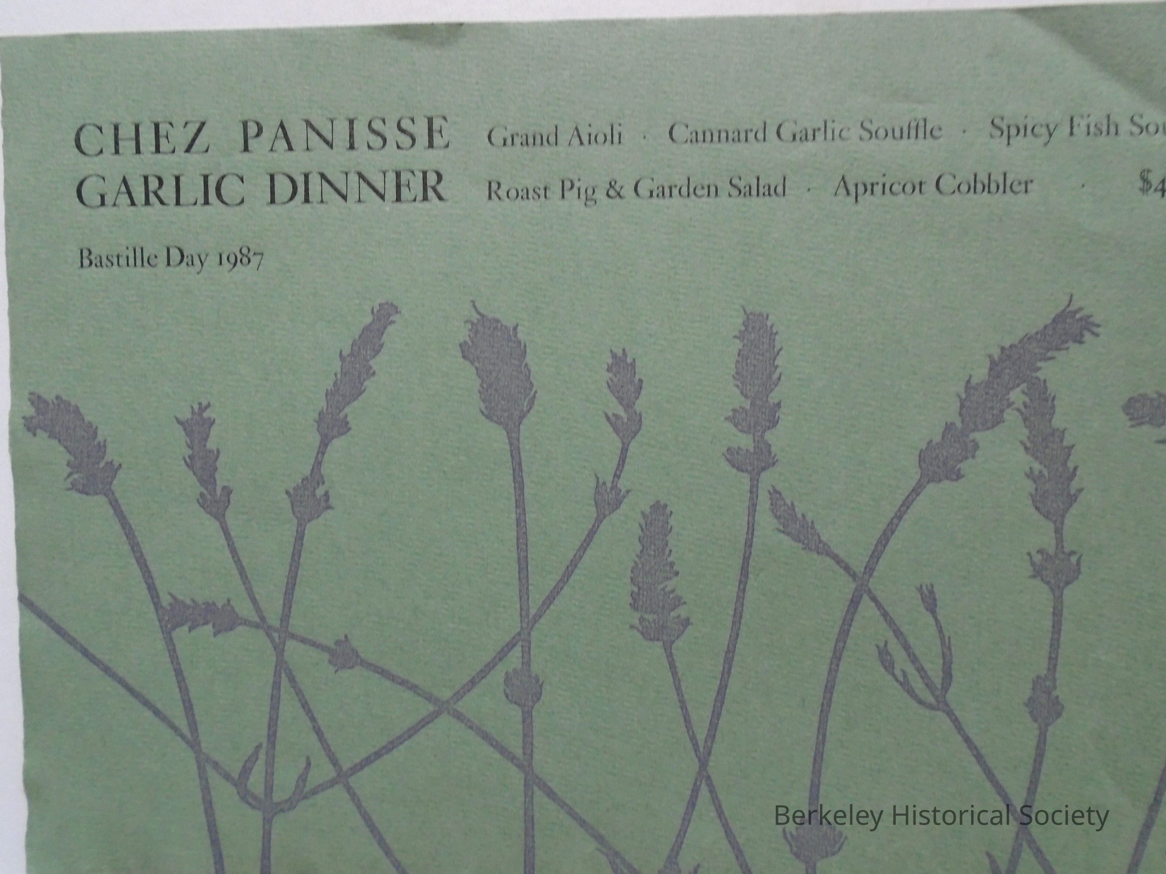 Chez Panisse paper menu for Garlic Dinner, Bastille Day 1987. Moss green paper with floral design, ragged bottom edge.