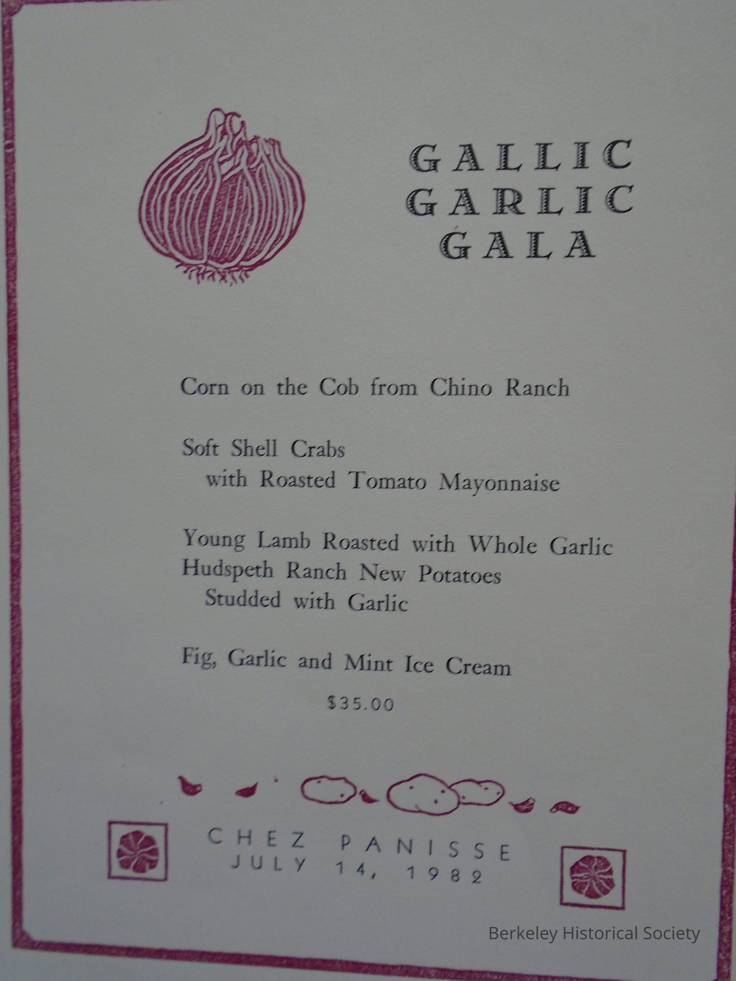 Chez Panisse paper menu for Gallic Garlic Gala, July 14, 1989.