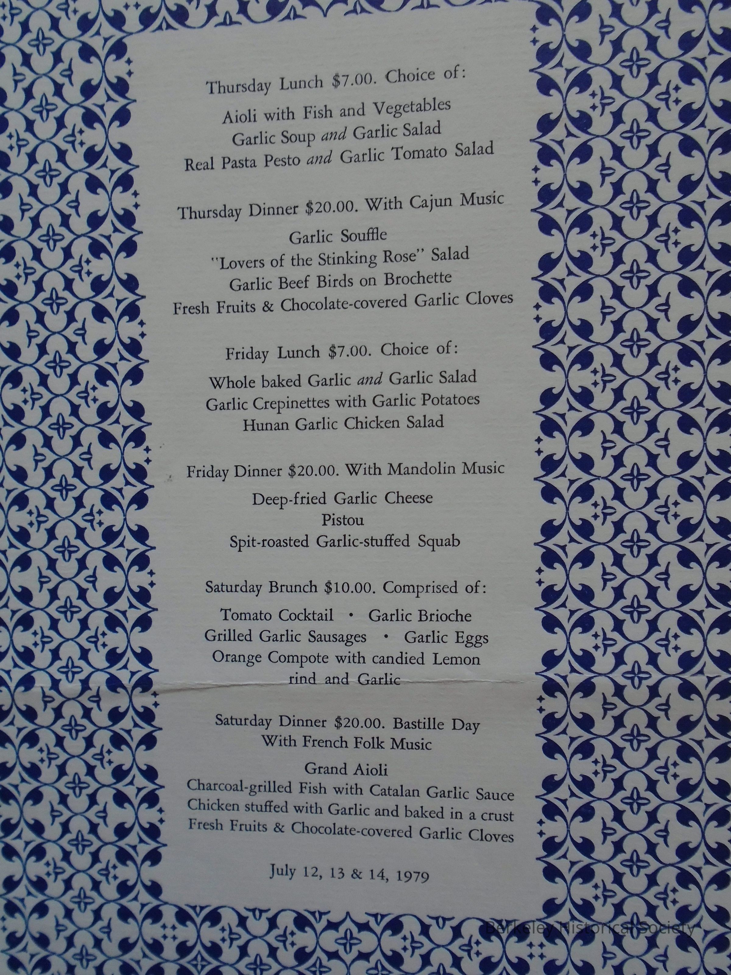 Chez Panisse paper menu for Garlic Frenzy!!! 4th Annual Garlic Festival Chez Panisse: Berkeley, July 12, 13 & 14, 1979.