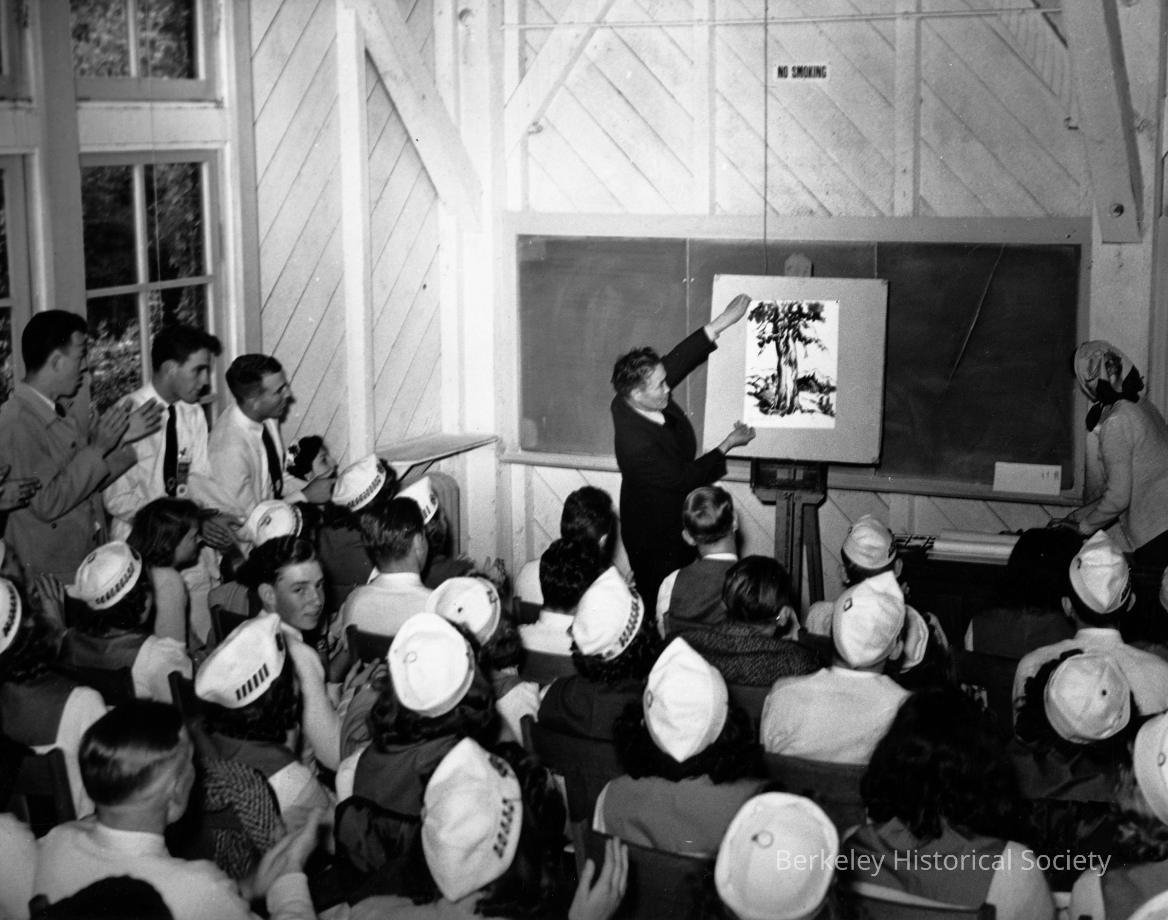 Lecturing about artwork to group, many of whom are wearing similar caps. Unidentified wooden building.Other Names and Numbers