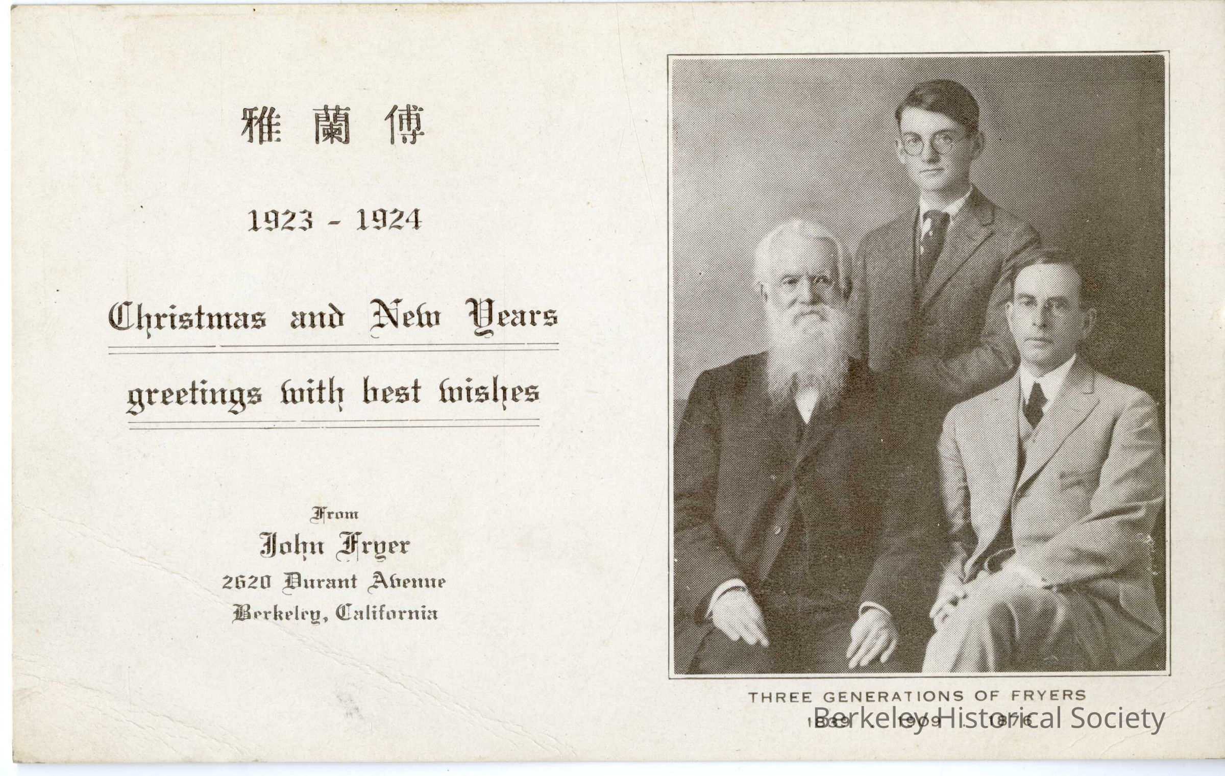 Undivided postcard featuring Christmas and New Years greeting and black and white portrait of three generations of men in the Fryers family. No message present.