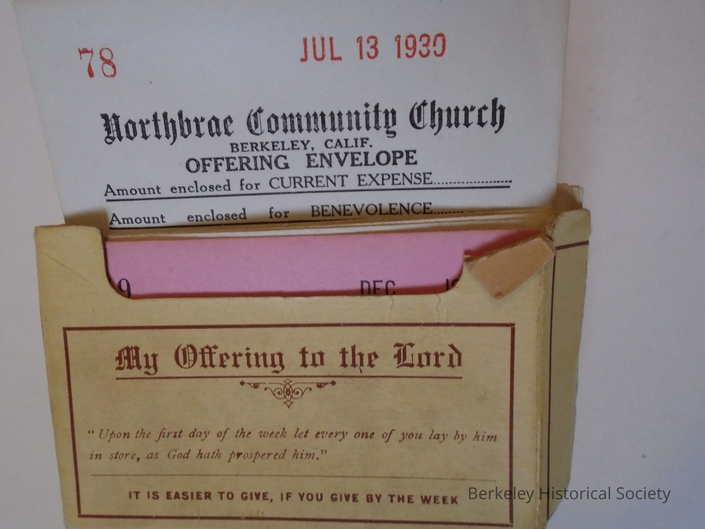 Cardboard Box of 27 offering envelopes for Northbrae Community Church, Berkeley, Calif. Box is beige with brown text/scripture on it and the name Margaret Hackley (Hadley?) written on it in black ink Envelopes are paper with misc dates in 1930 & 1931 stamped in red and another number (for reference?). White envelopes for current expense, pink for Building Debt Fund, blue for Sunday School and misc other including Easter and Christmas envelopes with religious scenes.