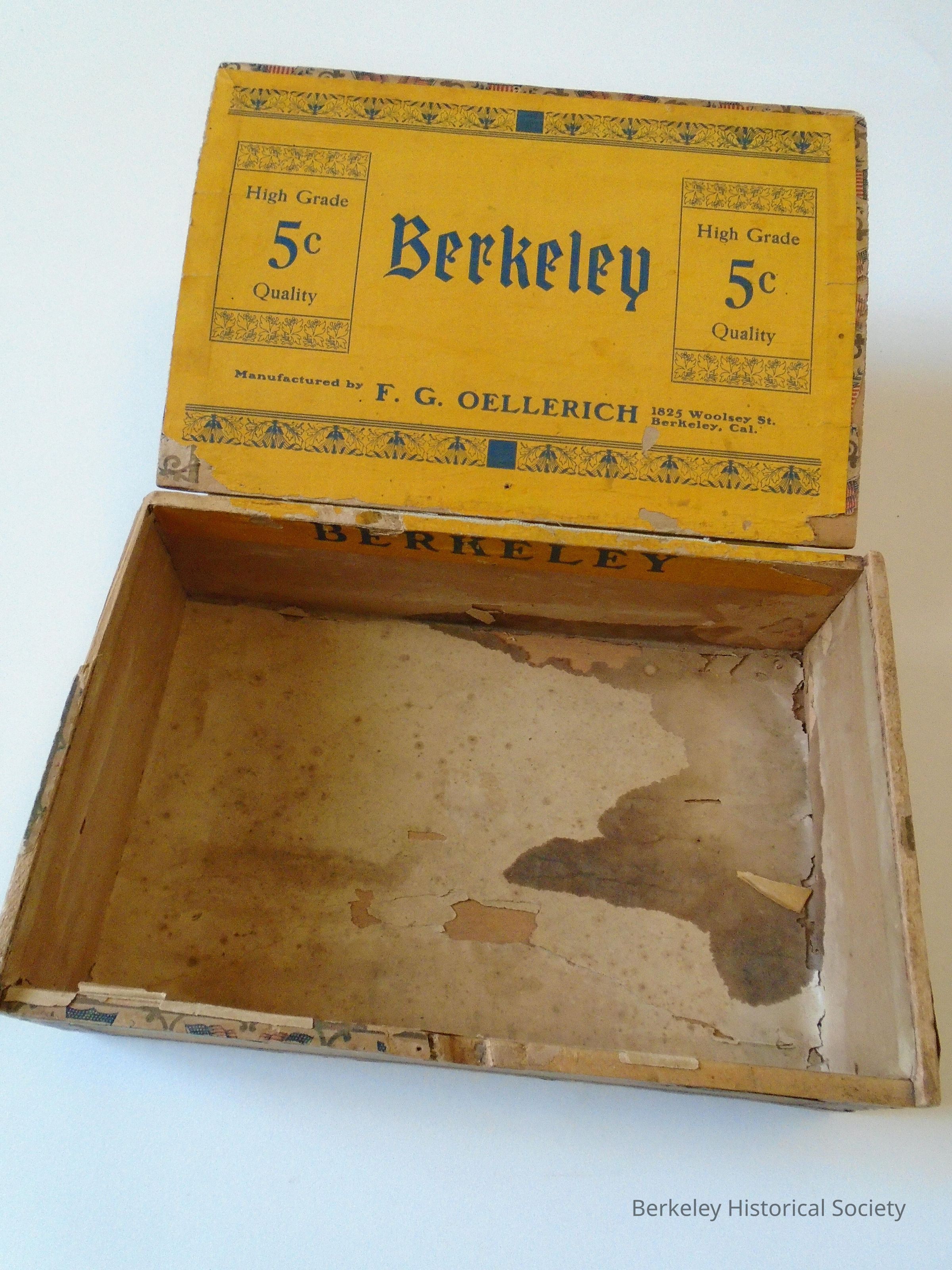 Wooden cigar box : Berkeley. Manufactured by F.G. Oellerich , 1825 Woolsey St., Berkeley, Cal. Seal shows Union Made, 1930. Sides show "Berkeley" and "Londres". Bottom of box "Factory No. 651 1st Dist of Cal. " and warning, seal etc. Decoration around edges of American flags (in color). Top center shows crown, swords, fronds (tobacco?) and "Berkeley" . Inside of top is mustard yellow paper with "High Grade 5 c (cent) Quality" and manufacturers name.Made/Created