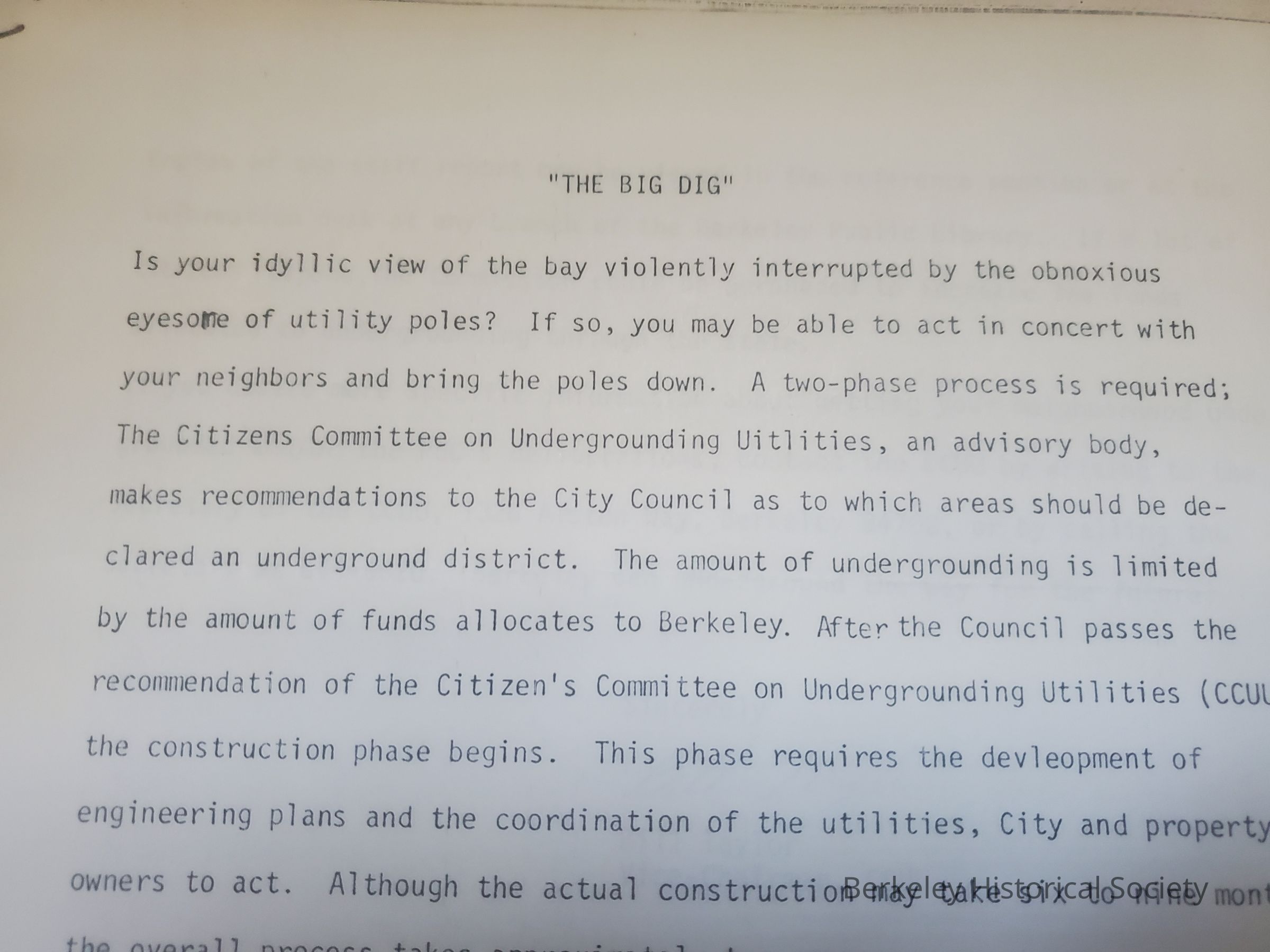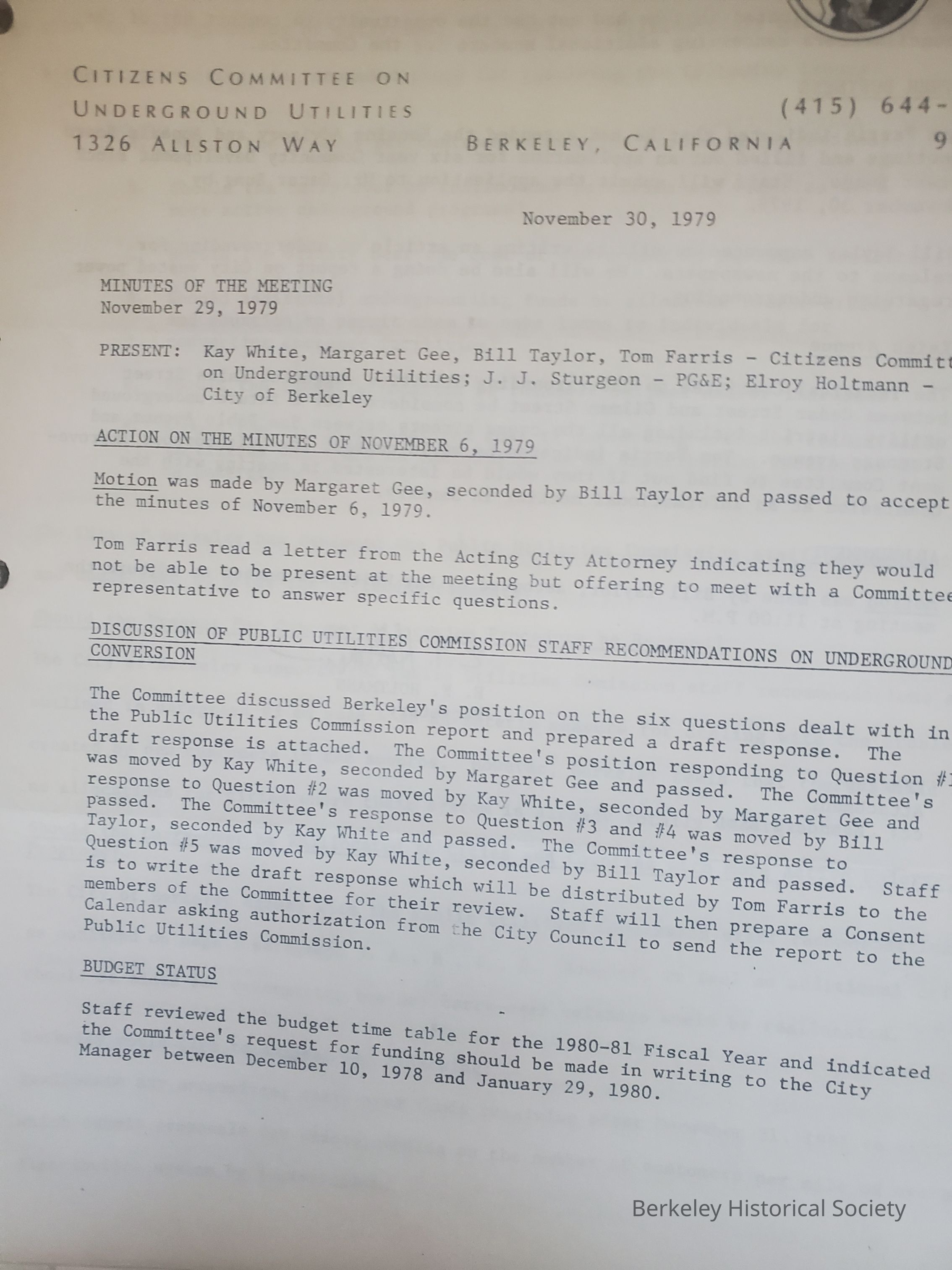 Minutes of the committee and other materials concerning undergrounding of electric lines in Berkeley