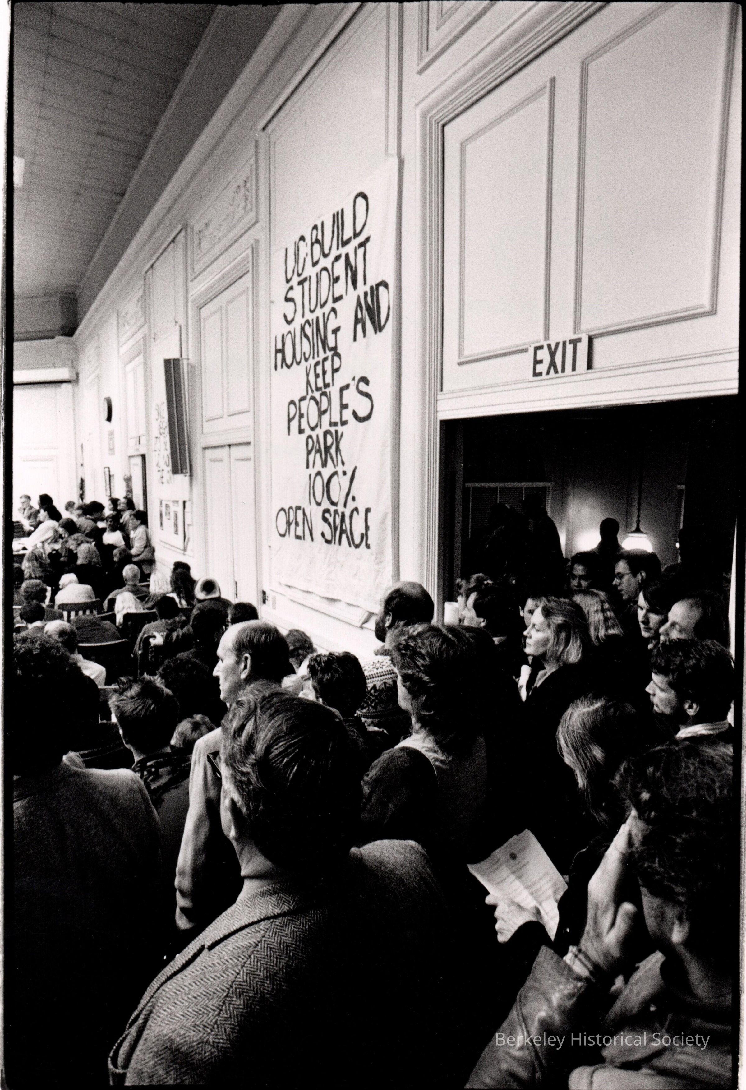 Not all People's Park supporters are able to enter the Council Chambers; meeting subsequently moved to the Veterans' Building.Dimensions